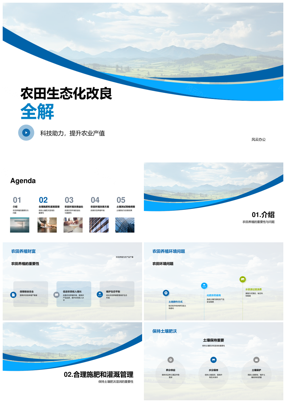 风云办公提供的生态农田养殖技术增效环保沃土绿田PPT模板,下载格式为pptx,一共25页,作品中文字及图均可以修改和编辑,图片更改请在作品中右键图片并更换,文字修改请直接点击文字进行修改。