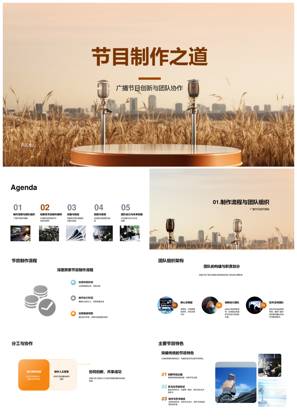 风云办公提供的广播节目制作团队协作创新流程设计PPT模板,下载格式为pptx,一共29页,作品中文字及图均可以修改和编辑,图片更改请在作品中右键图片并更换,文字修改请直接点击文字进行修改。