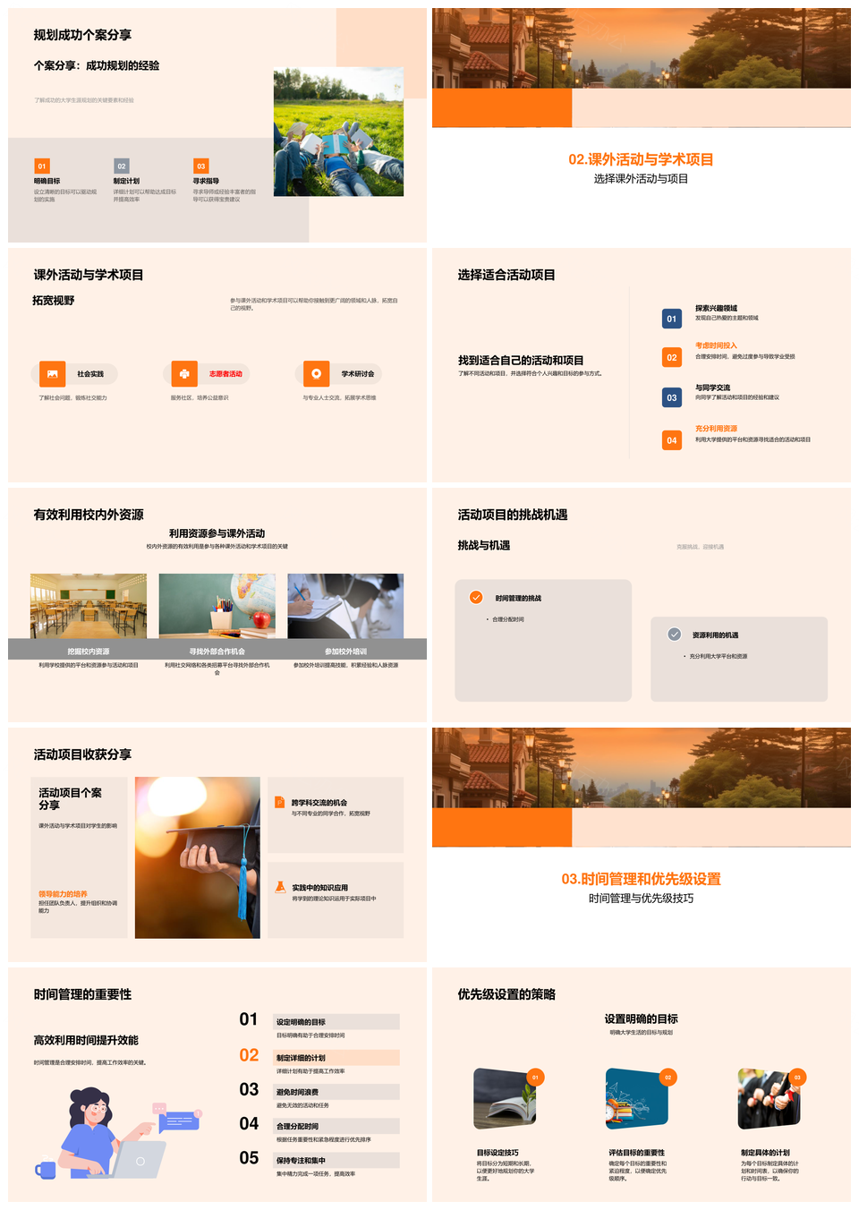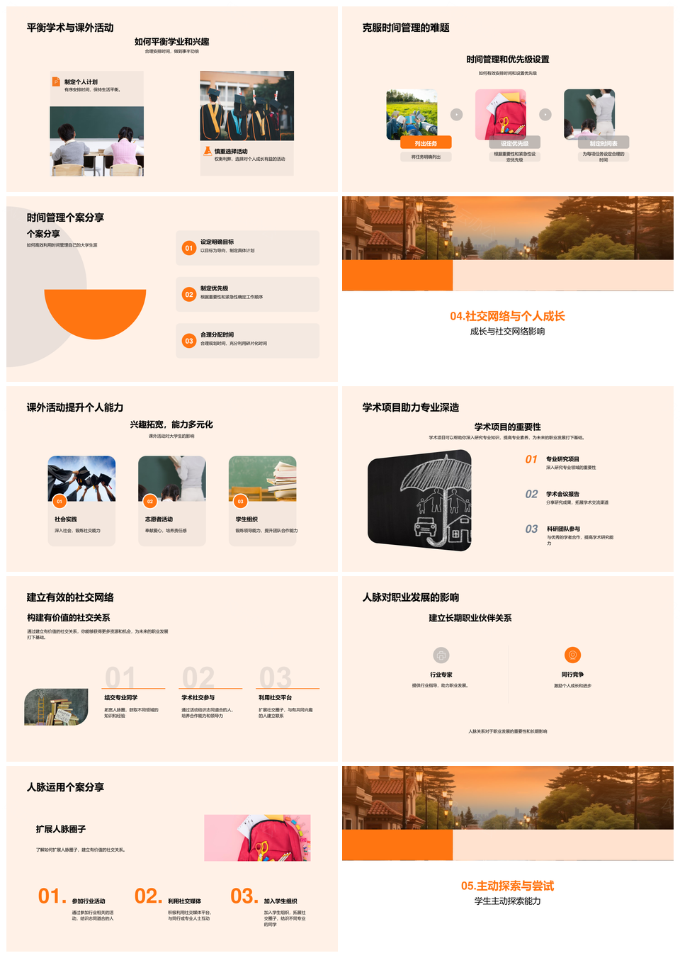 这是一张大学生涯规划全面成长学术课外时间管理社交拓展PPT模板,包含大学生涯、规划、全面成长、学术、课外、时间管理、社交拓展等主题内容,也可用作大学生涯规划全面成长、大学生涯规划课外时间管理、课外时间管理社交拓展、规划全面成长学术、全面成长学术课外时间、课外时间管理社交、全面成长学术社交、大学生涯规划学术、规划课外时间管理社交、学术课外时间管理、大学生涯社交拓展、规划管理社交拓展、全面课外时间管理、学术社交拓展、课外时间拓展等PPT场景使用。 风云办公提供的大学生涯规划全面成长学术课外时间管理社交拓展PPT模板,下载格式为pptx,一共33页,作品中文字及图均可以修改和编辑,图片更改请在作品中右键图片并更换,文字修改请直接点击文字进行修改。