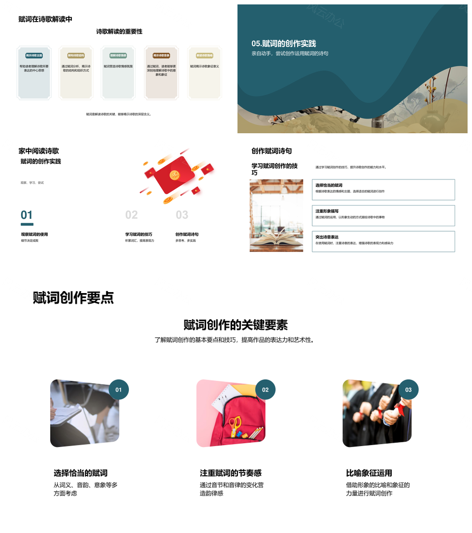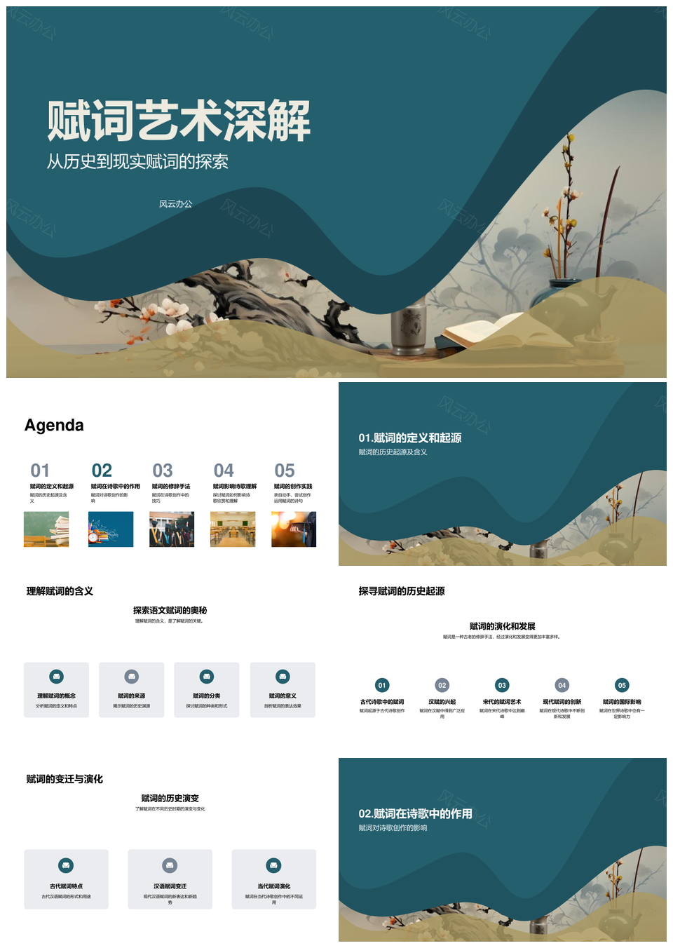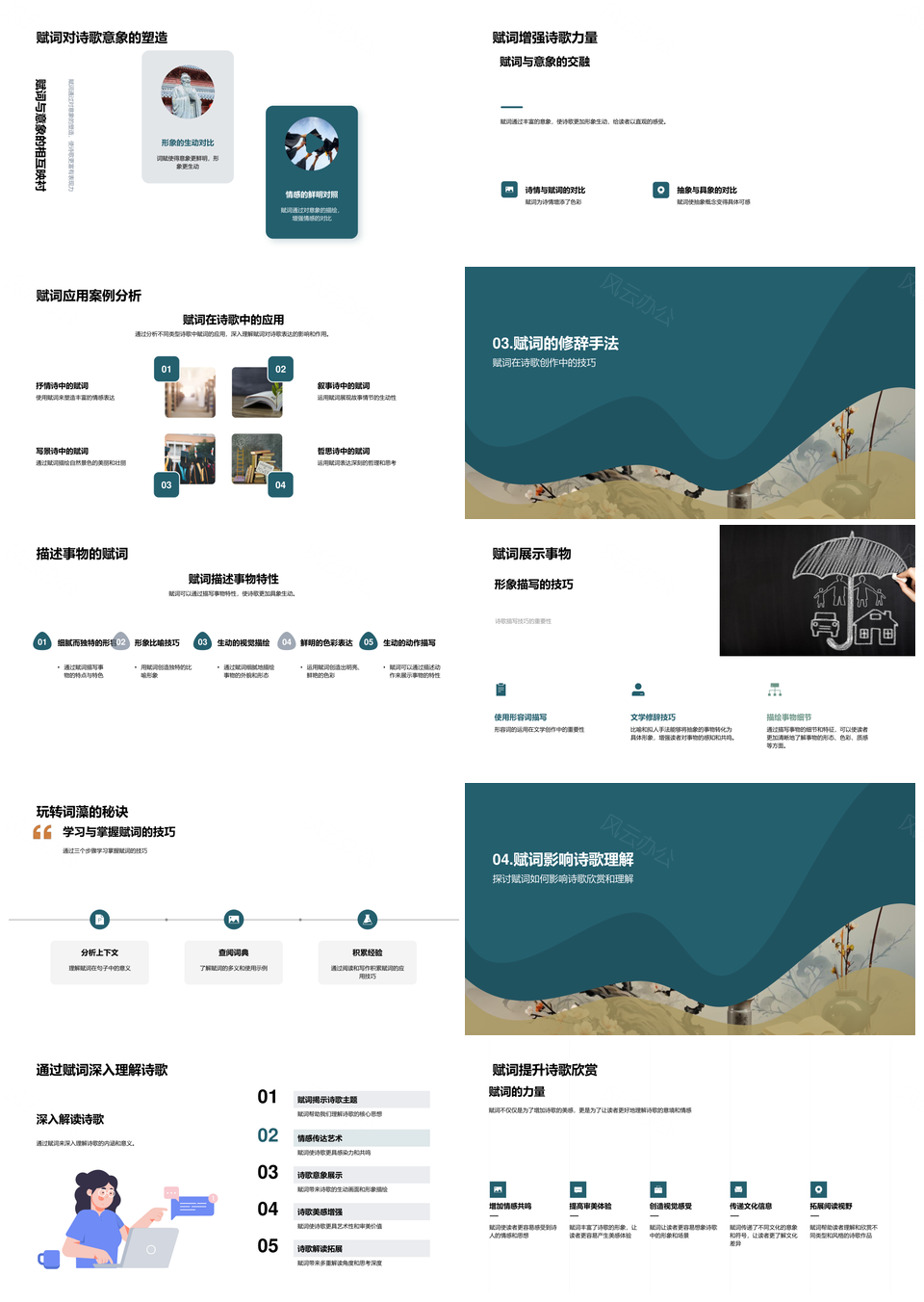 风云办公提供的赋词艺术源起诗象表现技巧古卷例析PPT模板,下载格式为pptx,一共23页,作品中文字及图均可以修改和编辑,图片更改请在作品中右键图片并更换,文字修改请直接点击文字进行修改。