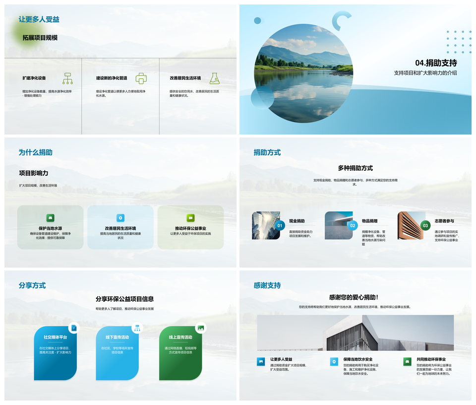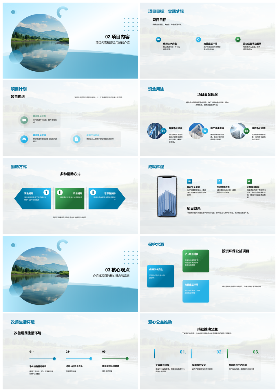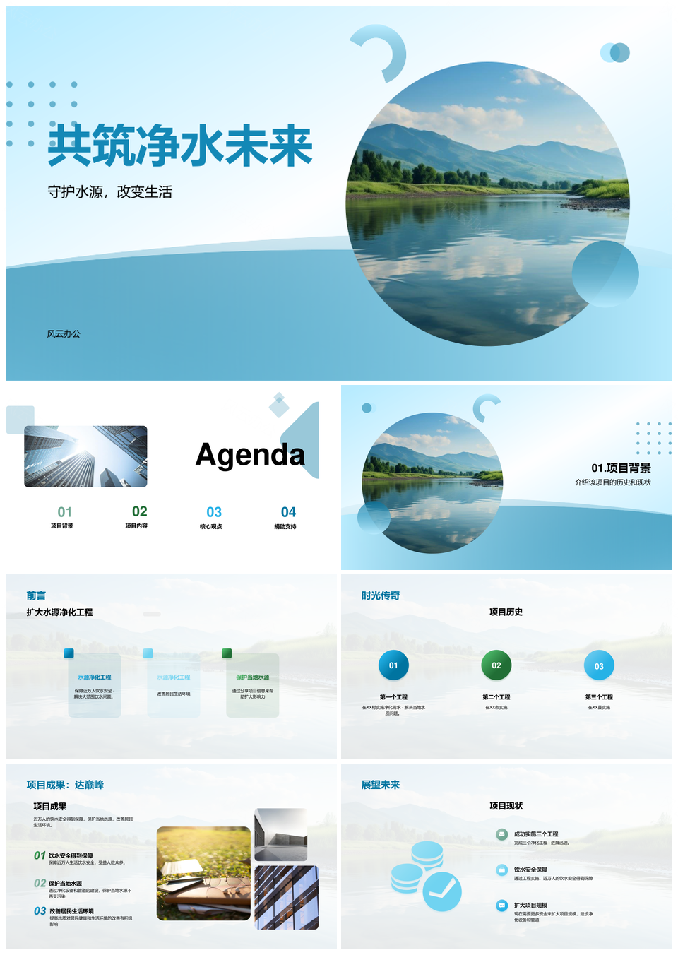 风云办公提供的环保公益组织捐助共建水源净化工程PPT模板,下载格式为pptx,一共24页,作品中文字及图均可以修改和编辑,图片更改请在作品中右键图片并更换,文字修改请直接点击文字进行修改。