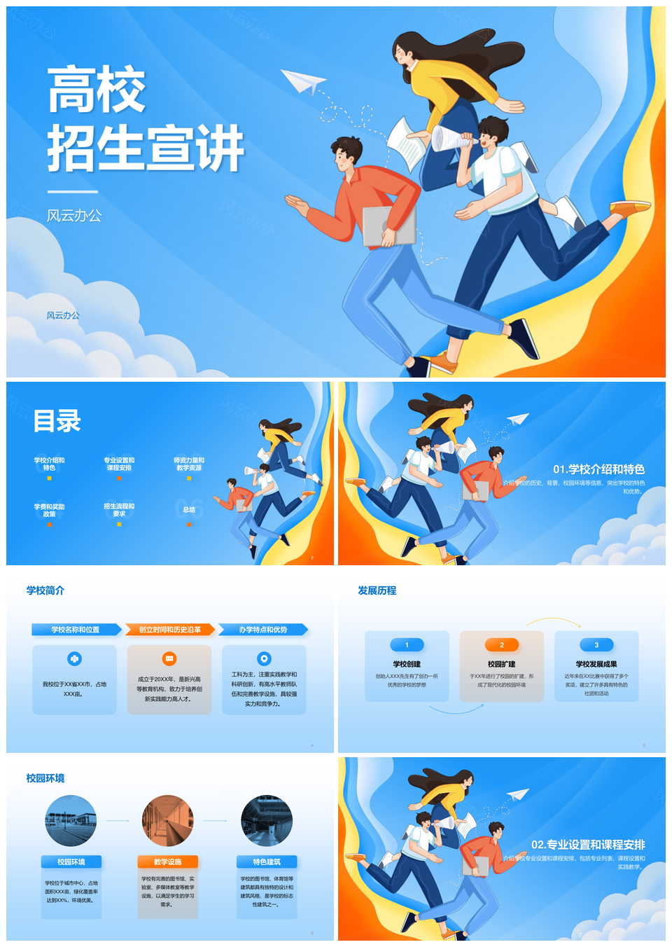 风云办公提供的蓝橙插画卡通高校招生宣传教育PPT模板,下载格式为pptx,一共25页,作品中文字及图均可以修改和编辑,图片更改请在作品中右键图片并更换,文字修改请直接点击文字进行修改。