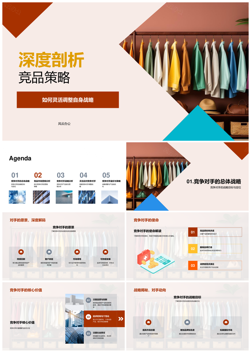 风云办公提供的时尚服装竞品战略调整与市场定位拆解PPT模板,下载格式为pptx,一共33页,作品中文字及图均可以修改和编辑,图片更改请在作品中右键图片并更换,文字修改请直接点击文字进行修改。