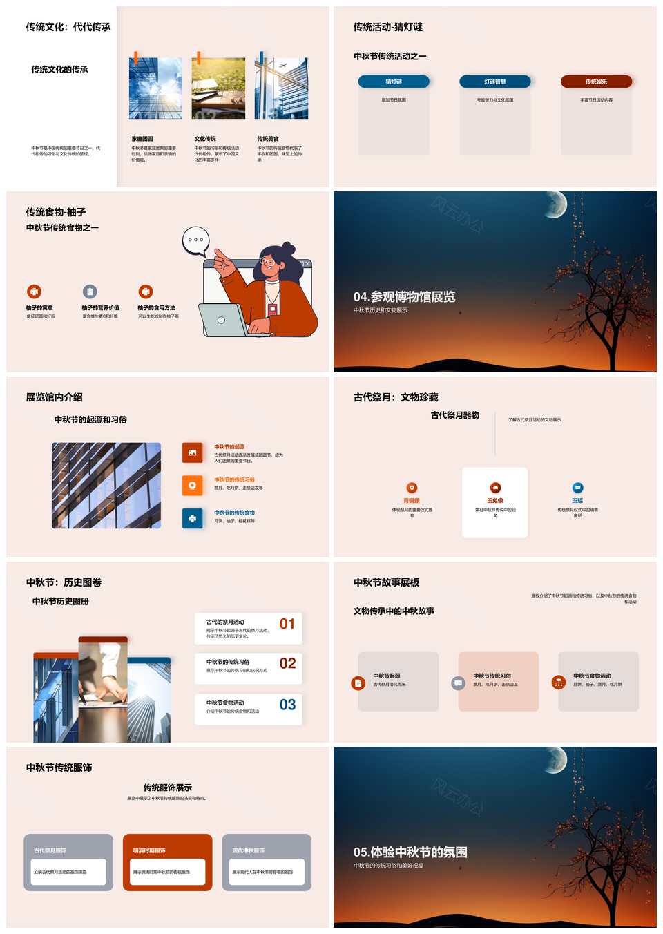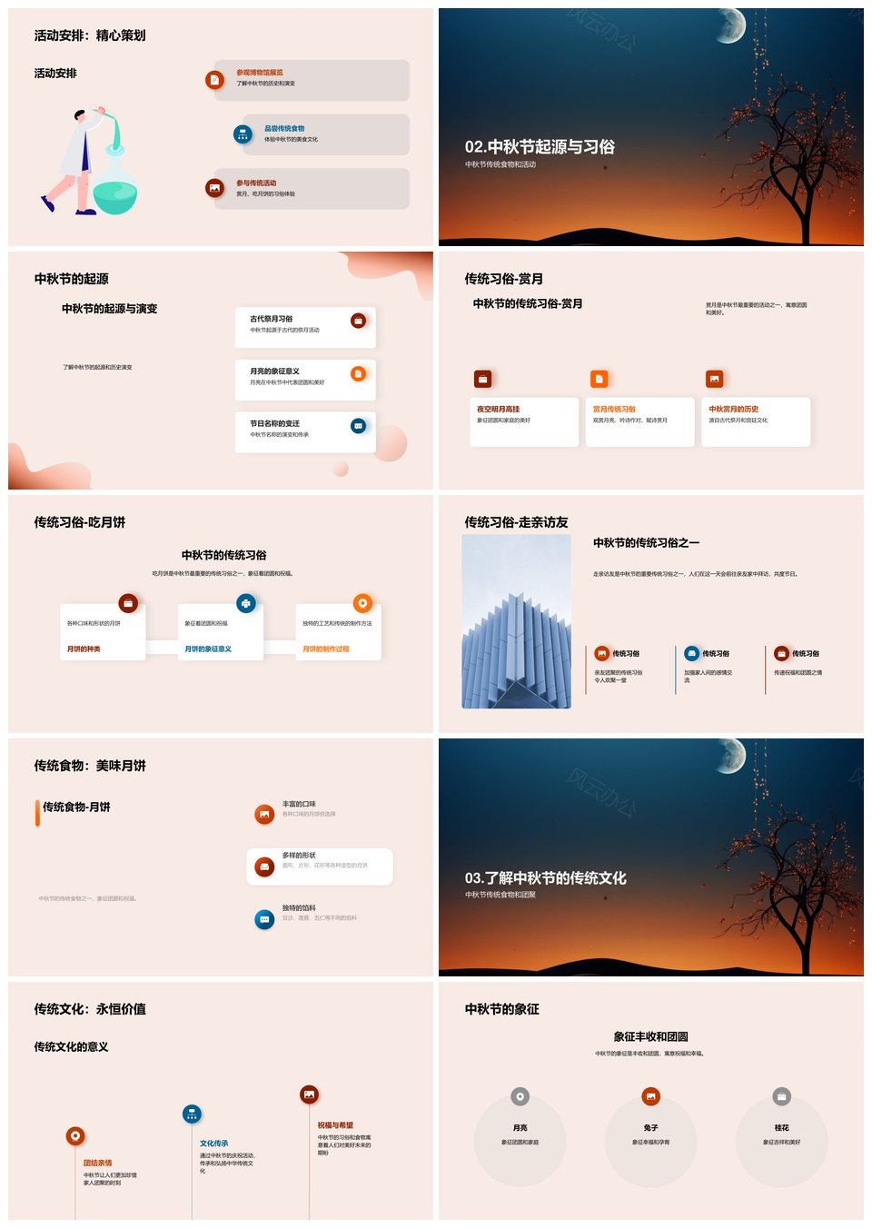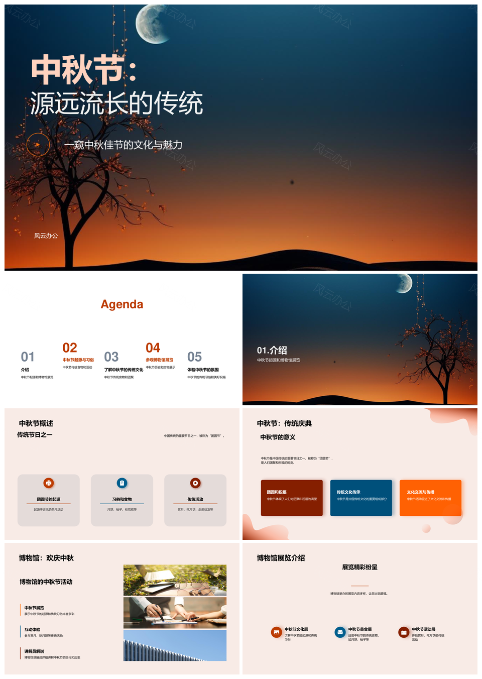 风云办公提供的中秋文化之旅团圆习俗探月起源PPT模板,下载格式为pptx,一共33页,作品中文字及图均可以修改和编辑,图片更改请在作品中右键图片并更换,文字修改请直接点击文字进行修改。