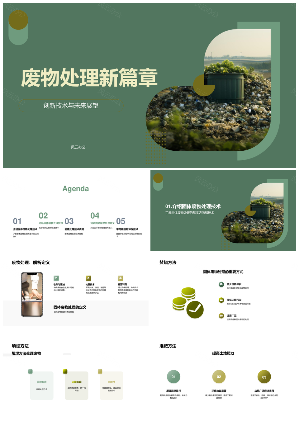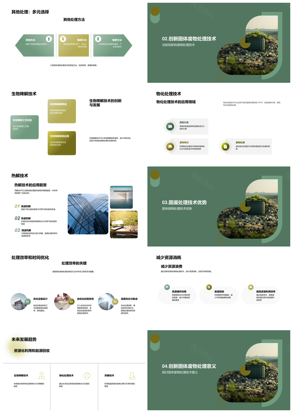 风云办公提供的固废处理技术焚烧填埋堆肥创新提效PPT模板,下载格式为pptx,一共23页,作品中文字及图均可以修改和编辑,图片更改请在作品中右键图片并更换,文字修改请直接点击文字进行修改。