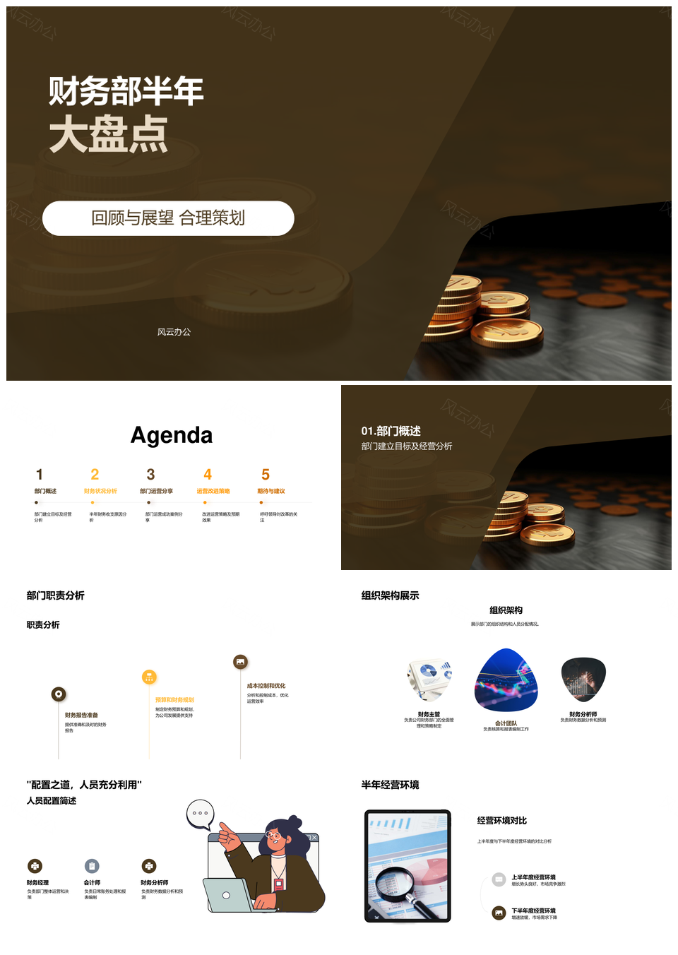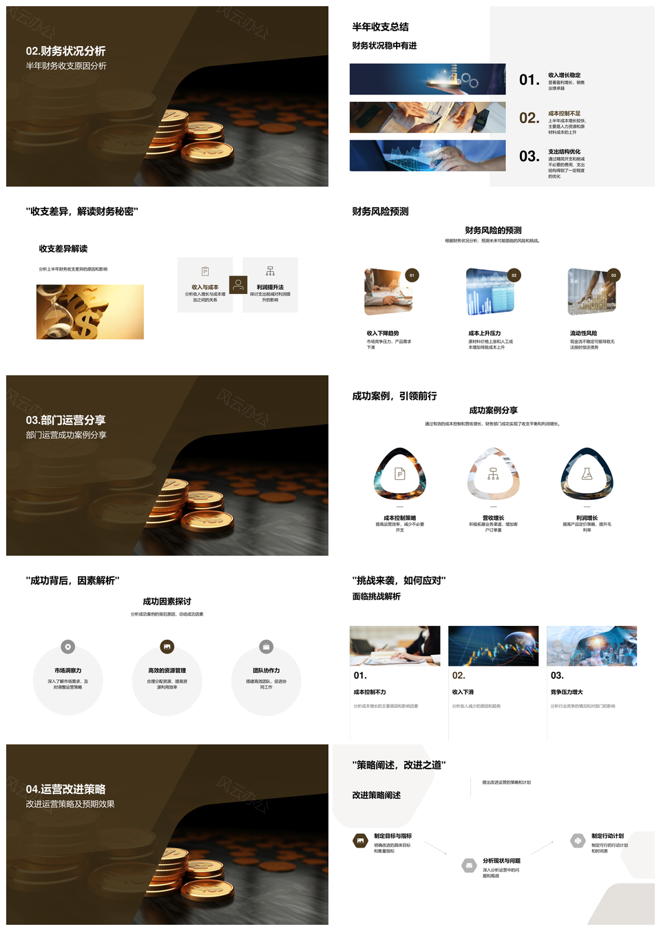 风云办公提供的财务部半年盘点收支挑战及改进策略PPT模板,下载格式为pptx,一共24页,作品中文字及图均可以修改和编辑,图片更改请在作品中右键图片并更换,文字修改请直接点击文字进行修改。
