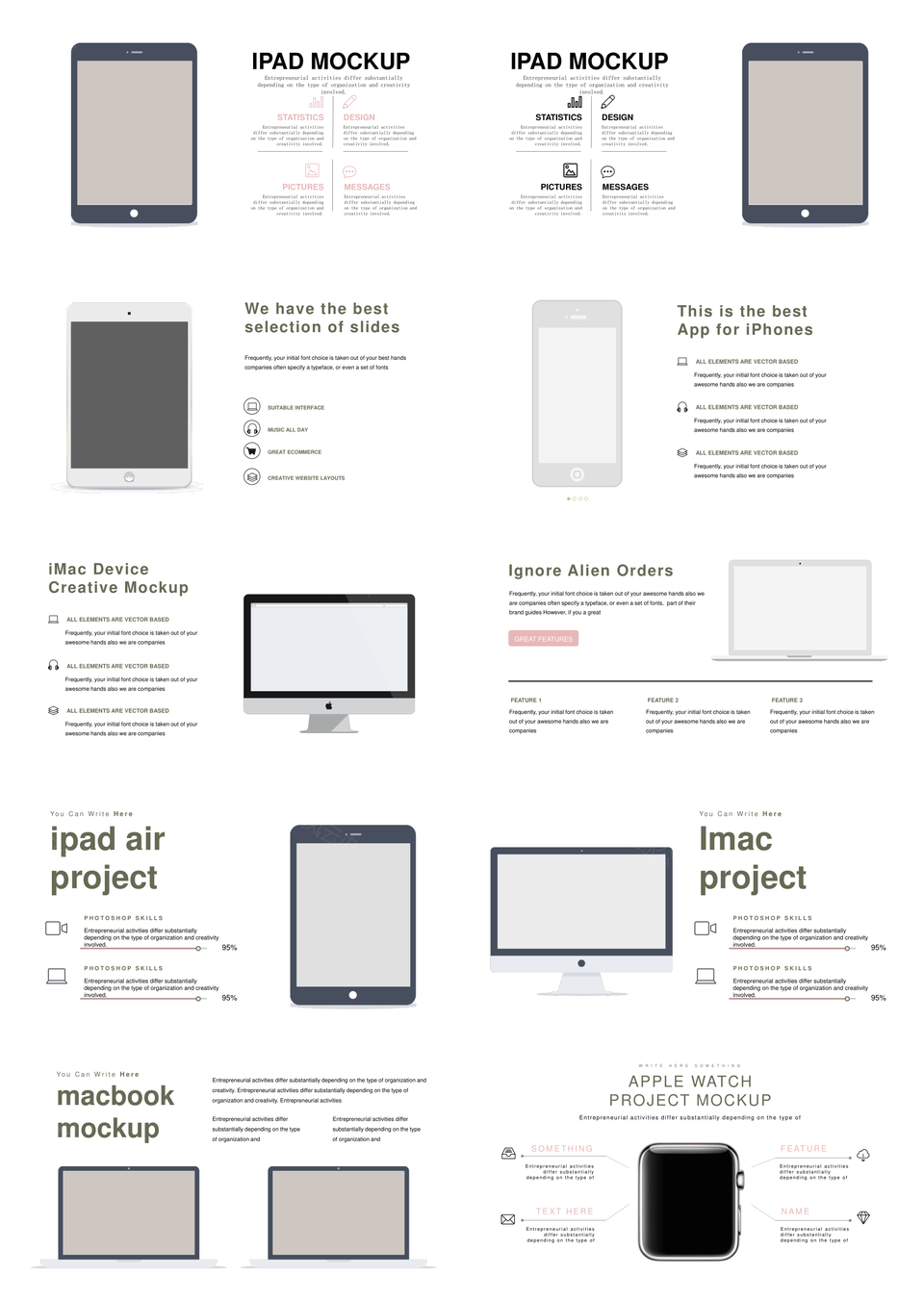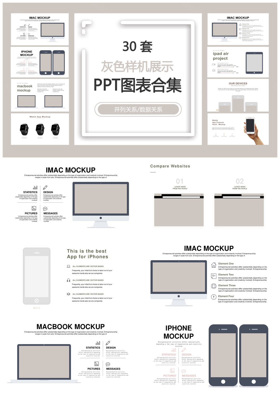 风云办公提供的灰色样机展示并列关系数据关系PPT图表合集,下载格式为pptx,一共31页,作品中文字及图均可以修改和编辑,图片更改请在作品中右键图片并更换,文字修改请直接点击文字进行修改。
