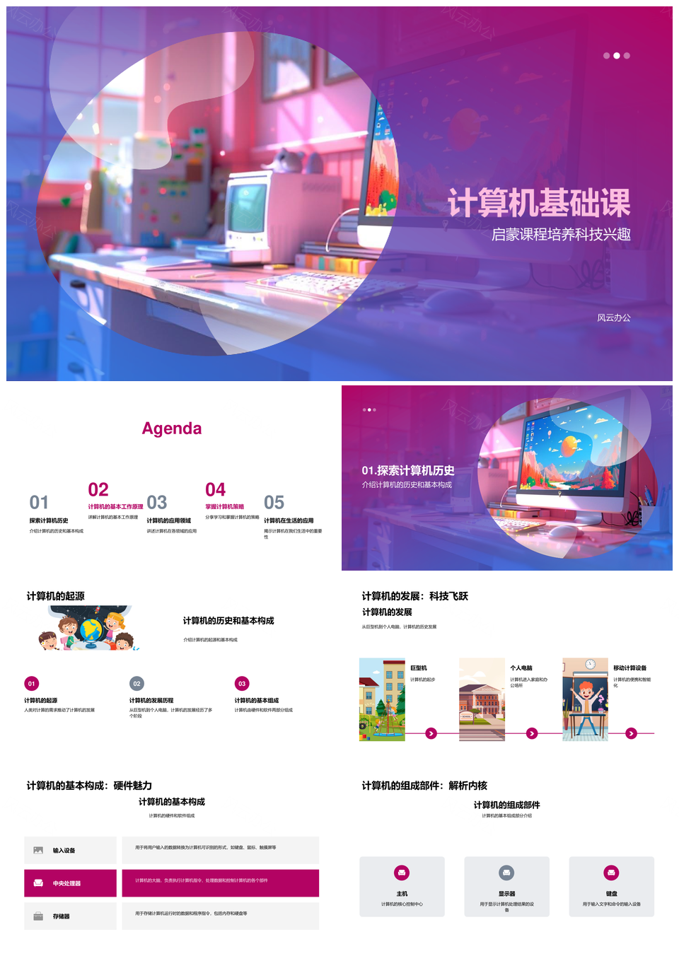 风云办公提供的计算机基础课科技兴趣教学模板,下载格式为pptx,一共33页,作品中文字及图均可以修改和编辑,图片更改请在作品中右键图片并更换,文字修改请直接点击文字进行修改。