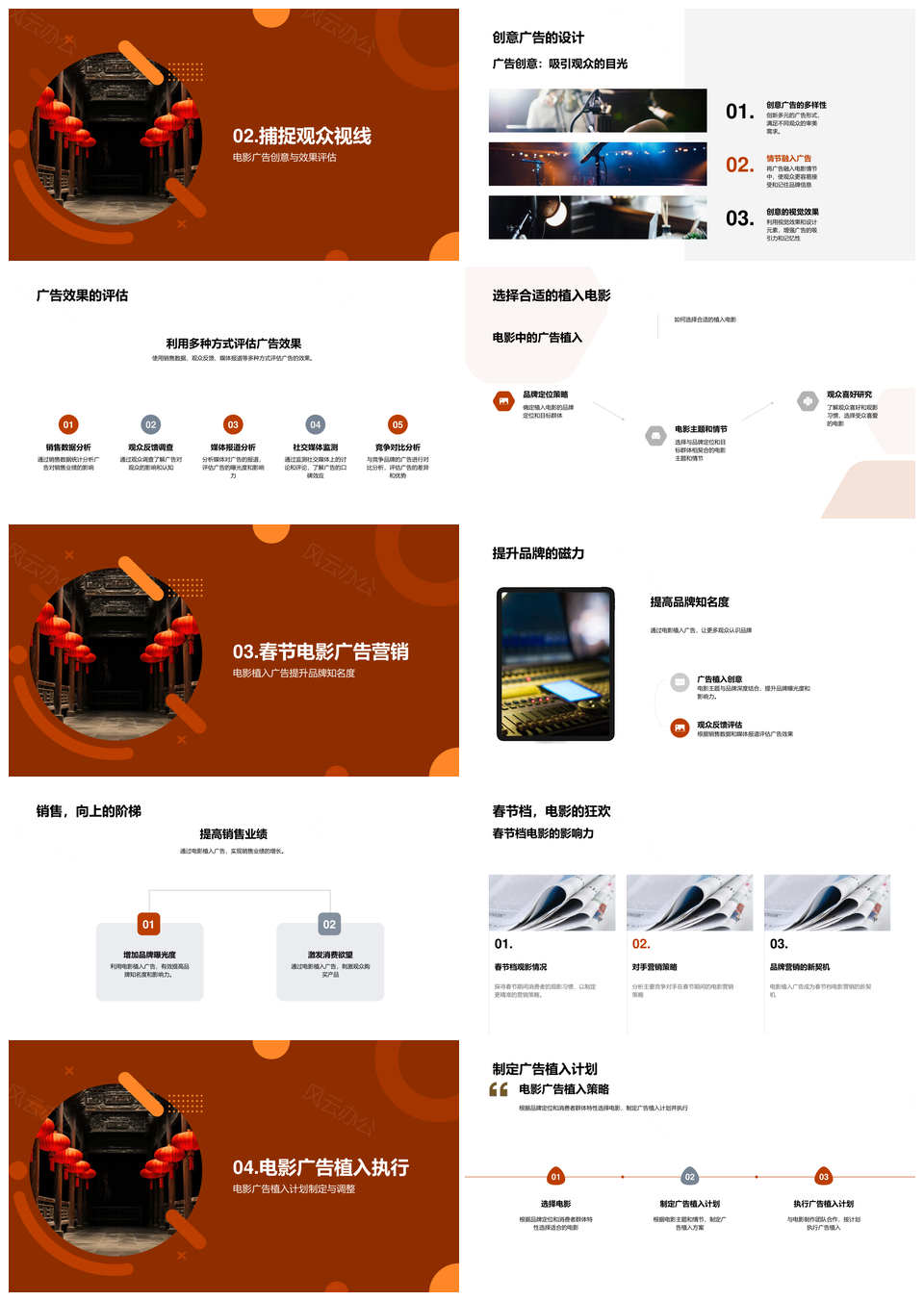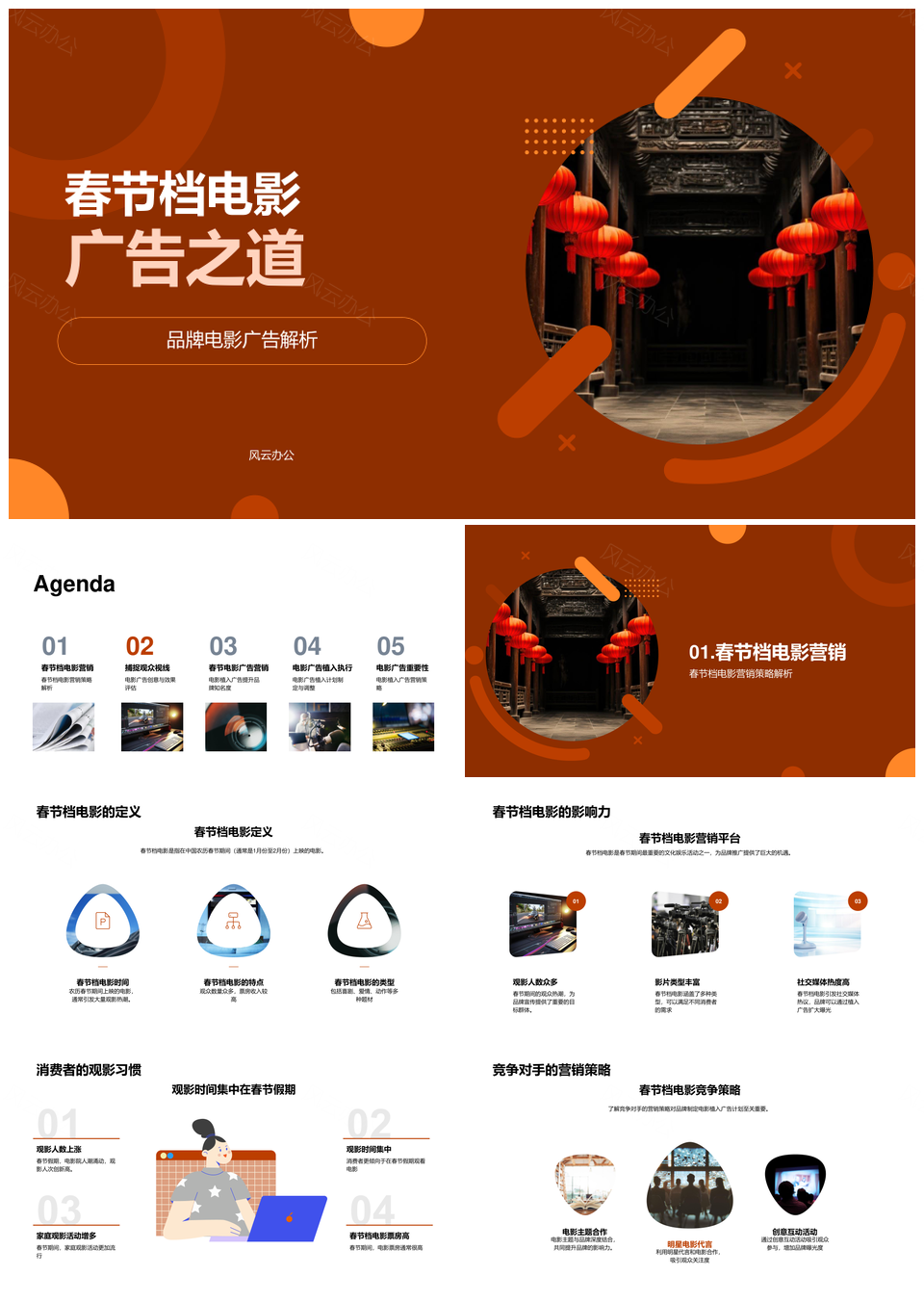 风云办公提供的春节档品牌电影广告创意植入解析PPT模板,下载格式为pptx,一共24页,作品中文字及图均可以修改和编辑,图片更改请在作品中右键图片并更换,文字修改请直接点击文字进行修改。