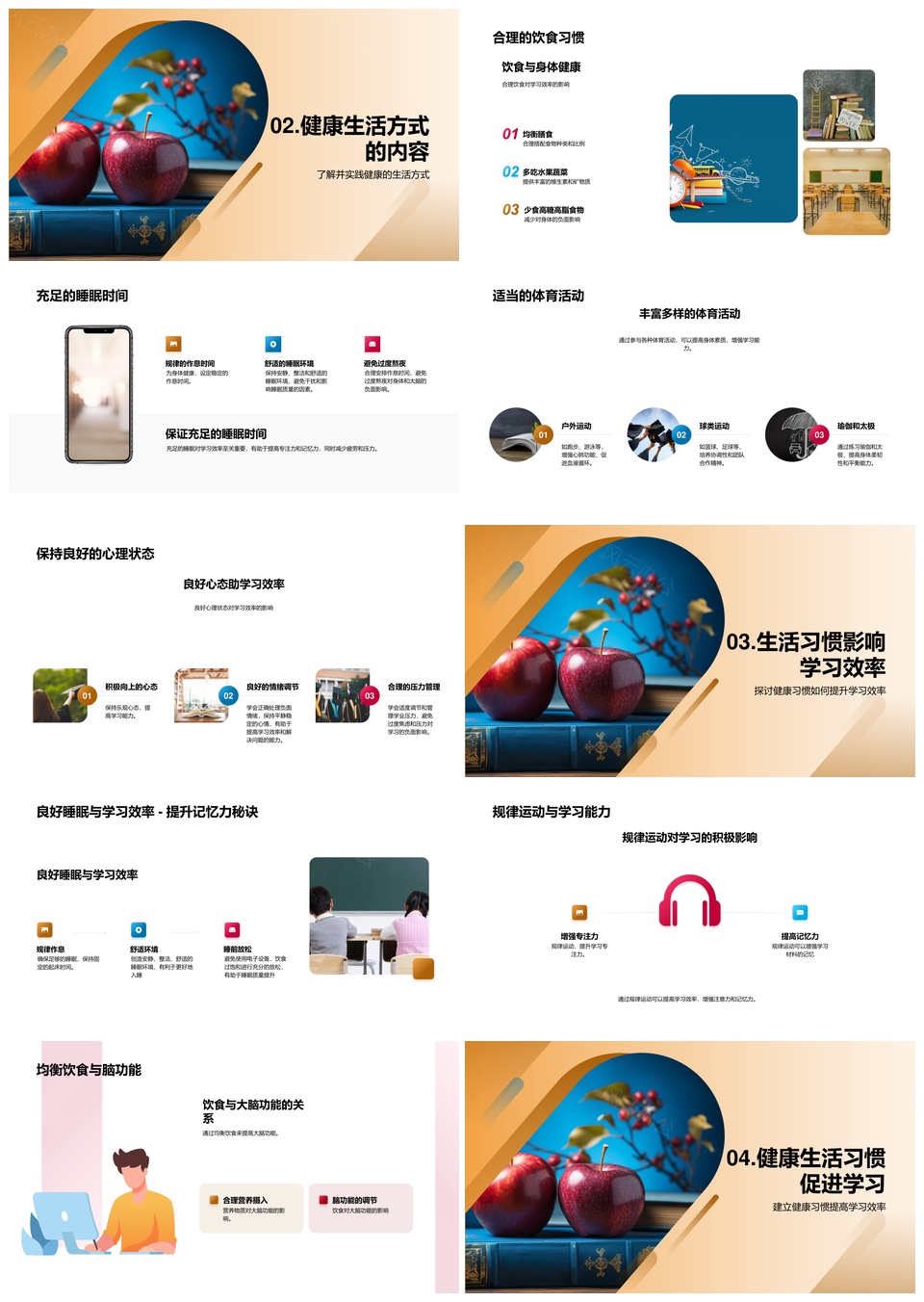 这是一张健康生活秘诀饮食运动睡眠心态苹果PPT模板,包含健康生活、秘诀、饮食、运动、睡眠、心态、苹果等主题内容,也可用作健康生活秘诀饮食、生活秘诀饮食运动、秘诀饮食运动睡眠、饮食运动睡眠心态、运动睡眠心态苹果、健康生活秘诀、生活秘诀饮食、秘诀饮食运动、饮食运动睡眠、运动睡眠心态、睡眠心态苹果、健康生活、生活秘诀、秘诀饮食、饮食运动等PPT场景使用。