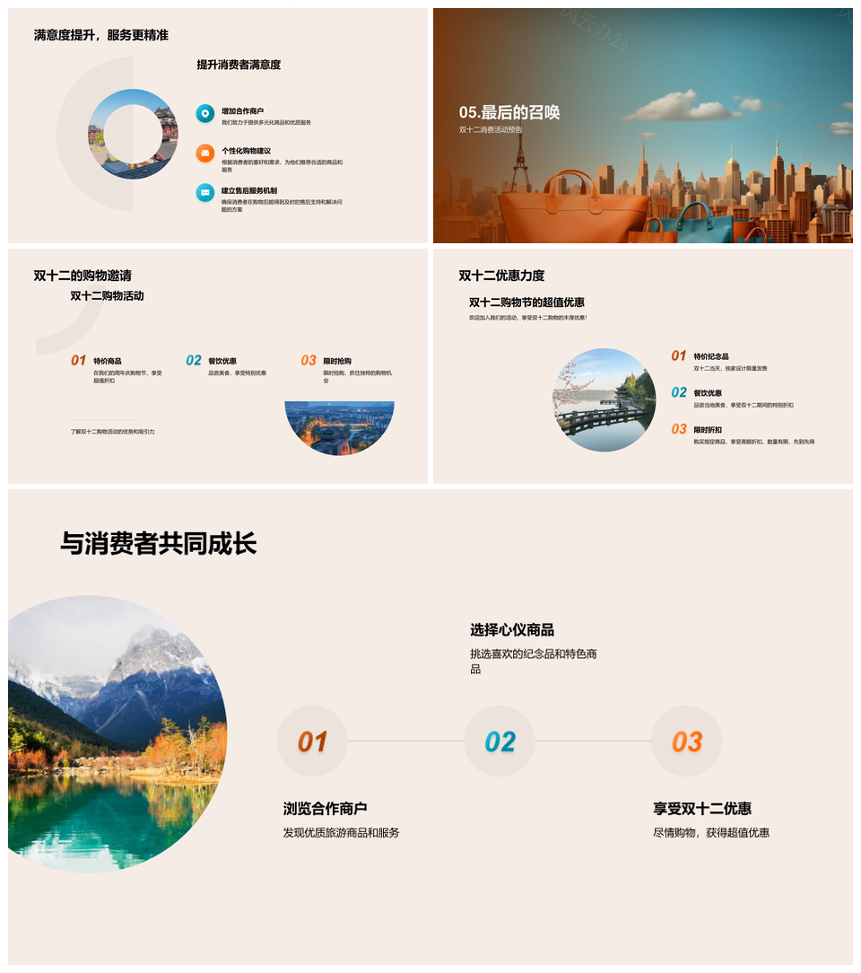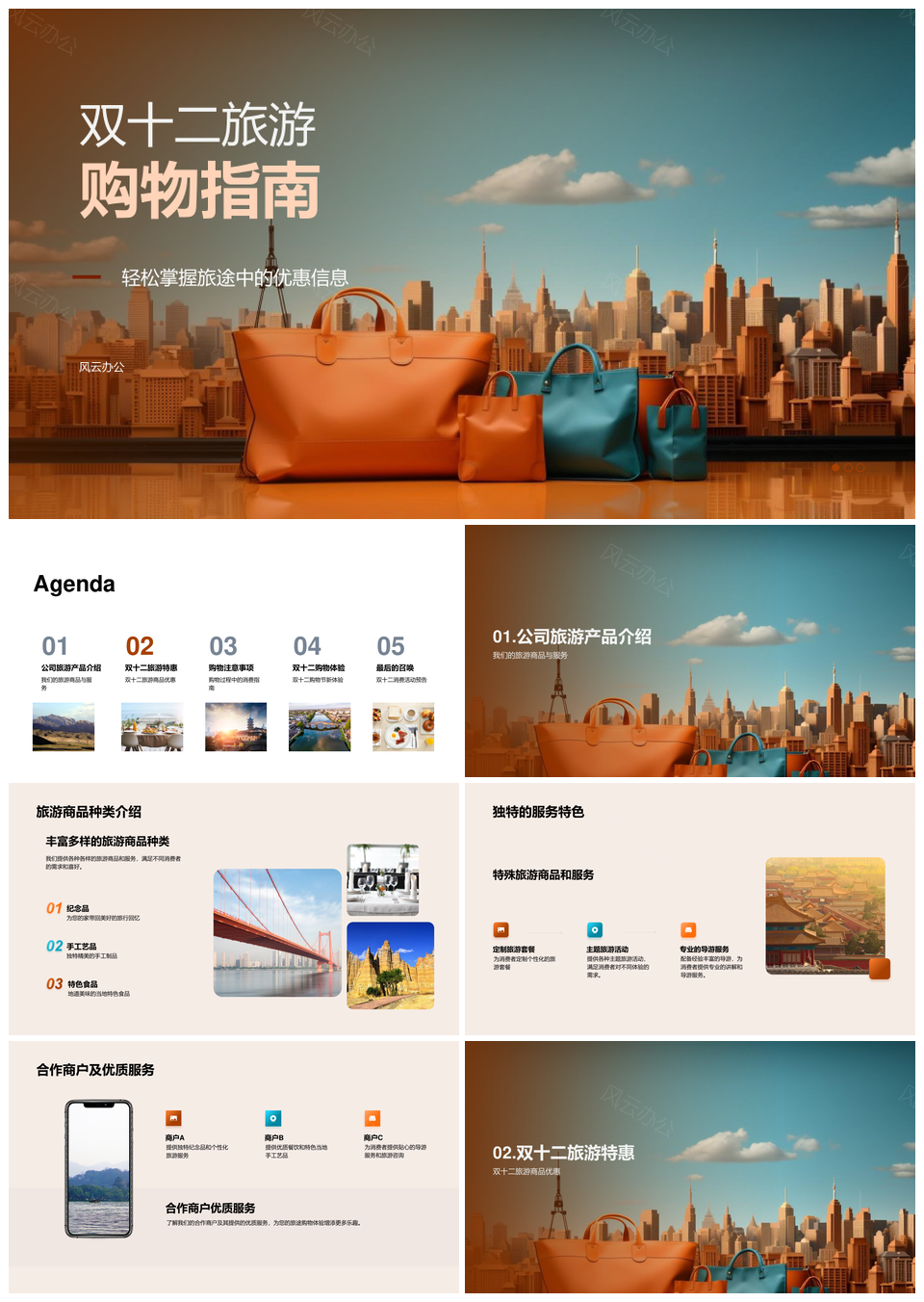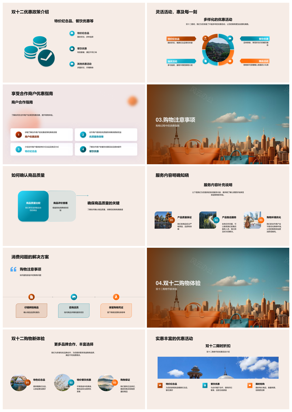 风云办公提供的双十二旅游购物优惠全指南PPT模板,下载格式为pptx,一共23页,作品中文字及图均可以修改和编辑,图片更改请在作品中右键图片并更换,文字修改请直接点击文字进行修改。