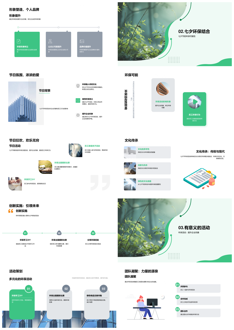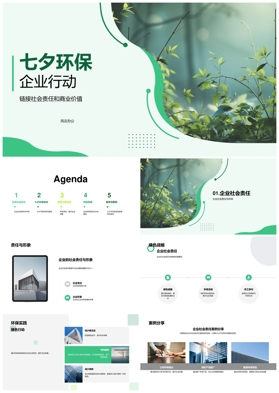 风云办公提供的七夕企业环保行动绿色责任赛竹林PPT模板,下载格式为pptx,一共33页,作品中文字及图均可以修改和编辑,图片更改请在作品中右键图片并更换,文字修改请直接点击文字进行修改。