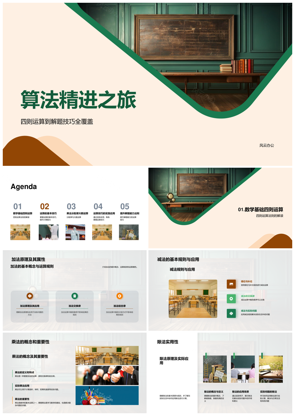 风云办公提供的算法精进四则运算法则与解题技巧PPT模板,下载格式为pptx,一共28页,作品中文字及图均可以修改和编辑,图片更改请在作品中右键图片并更换,文字修改请直接点击文字进行修改。