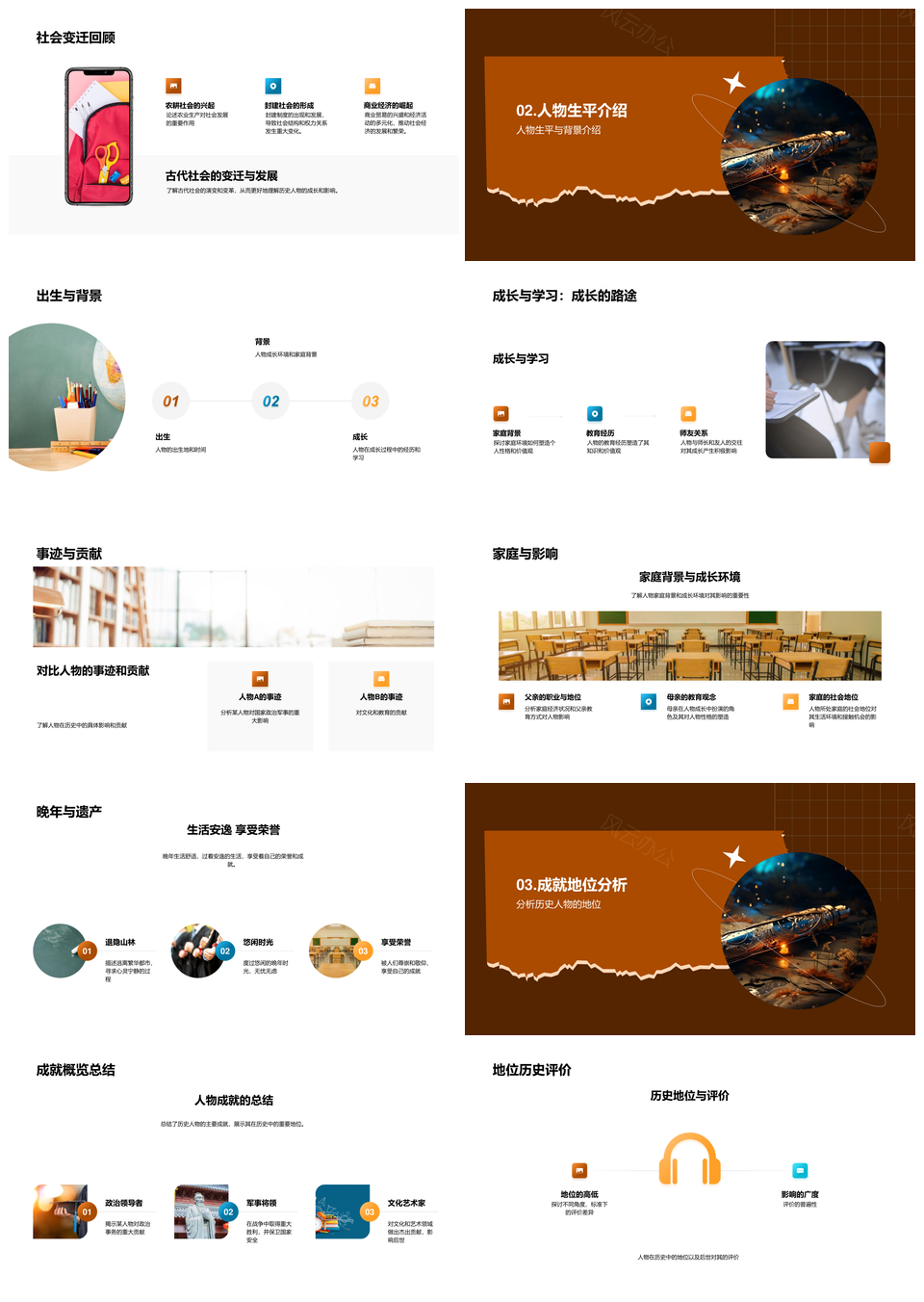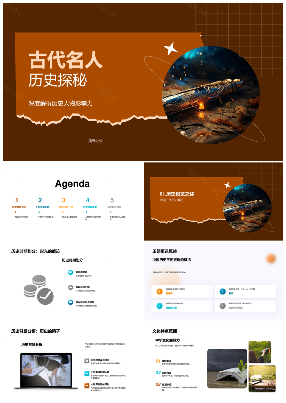 风云办公提供的古代名人历史背景成就影响探秘PPT模板,下载格式为pptx,一共33页,作品中文字及图均可以修改和编辑,图片更改请在作品中右键图片并更换,文字修改请直接点击文字进行修改。