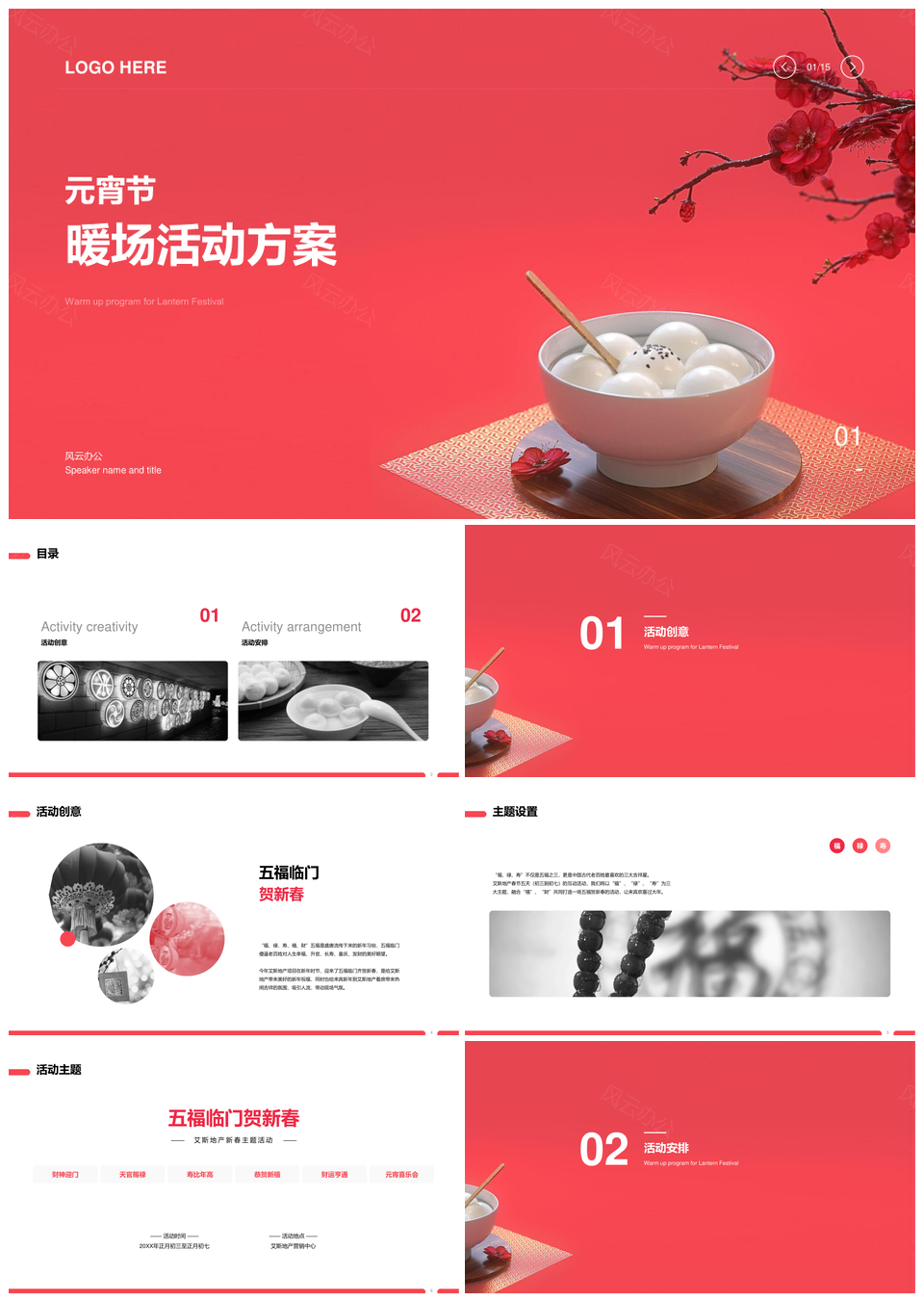 风云办公提供的红色元宵五福临门贺新春习俗活动方案PPT模板,下载格式为pptx,一共15页,作品中文字及图均可以修改和编辑,图片更改请在作品中右键图片并更换,文字修改请直接点击文字进行修改。