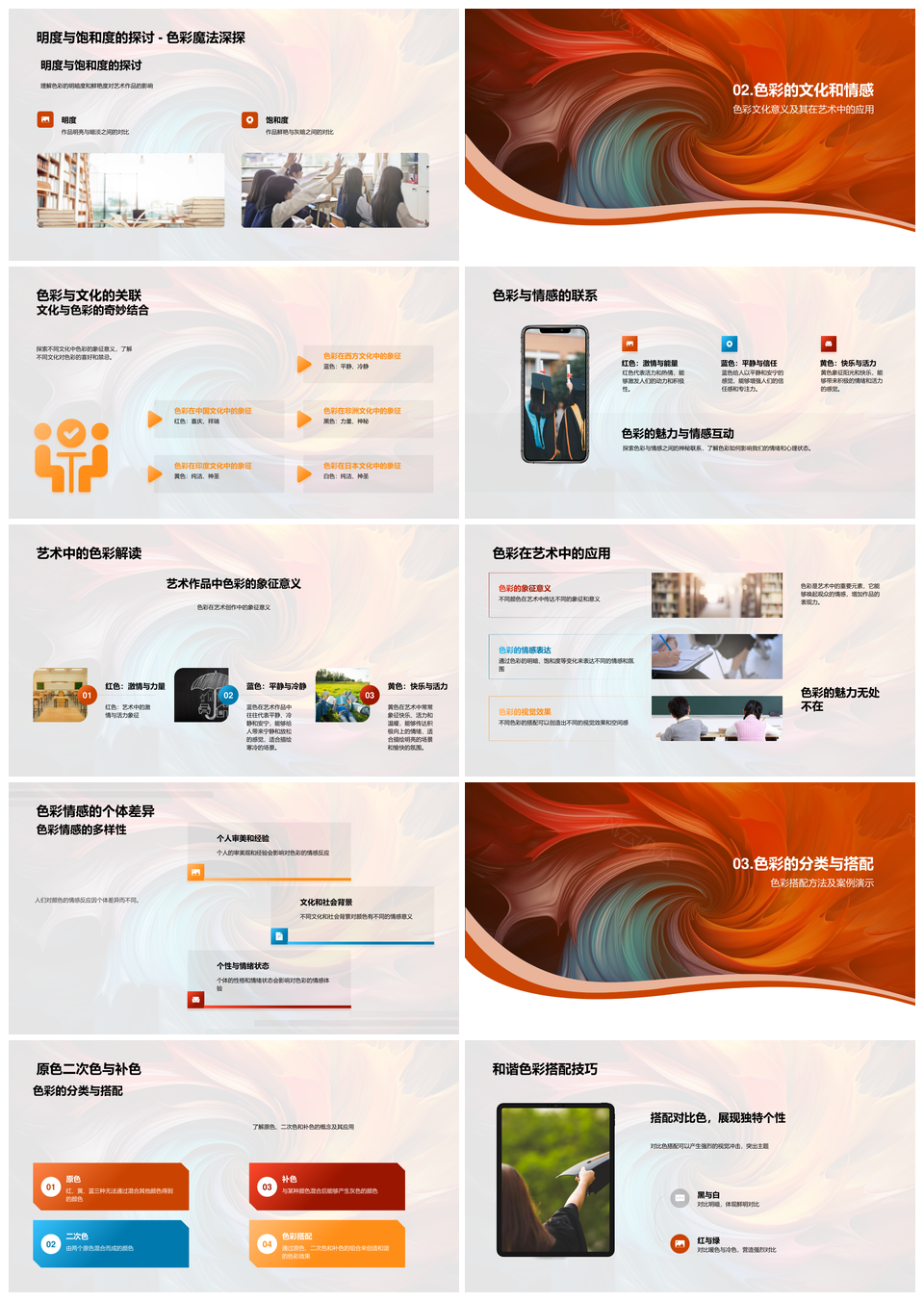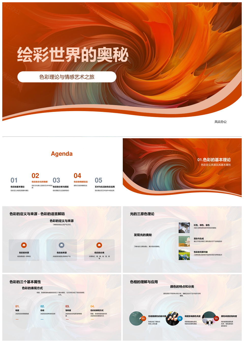 风云办公提供的色彩三原色色轮搭配情感文化探秘PPT模板,下载格式为pptx,一共33页,作品中文字及图均可以修改和编辑,图片更改请在作品中右键图片并更换,文字修改请直接点击文字进行修改。