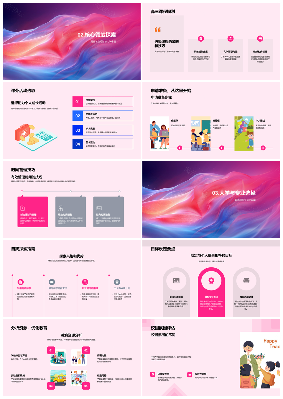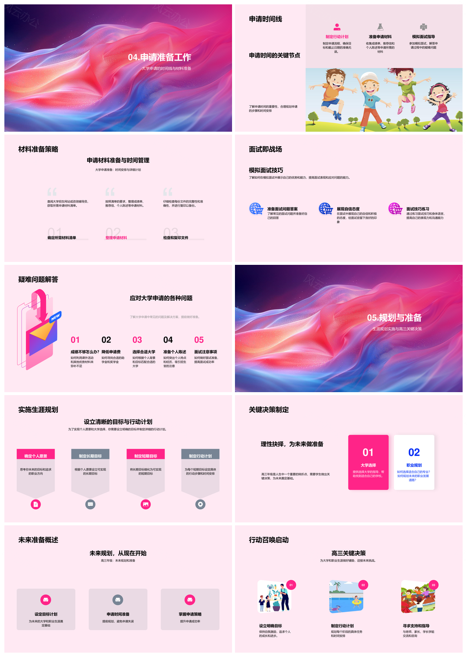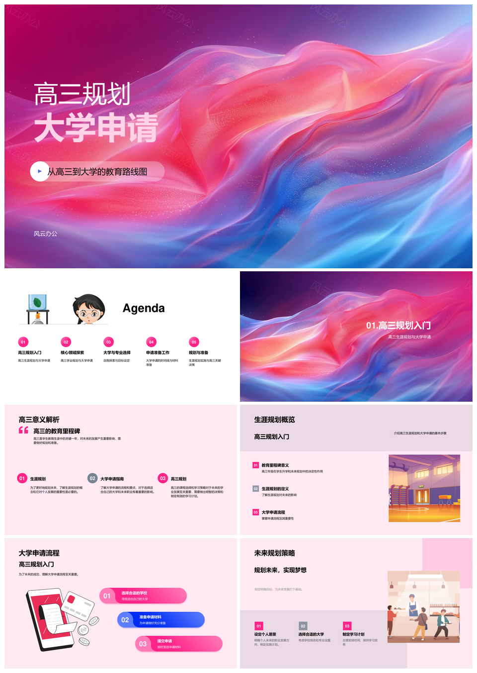风云办公提供的高三生涯学业规划与大学申请流程PPT模板,下载格式为pptx,一共28页,作品中文字及图均可以修改和编辑,图片更改请在作品中右键图片并更换,文字修改请直接点击文字进行修改。