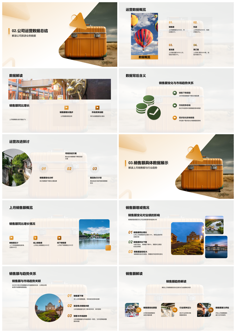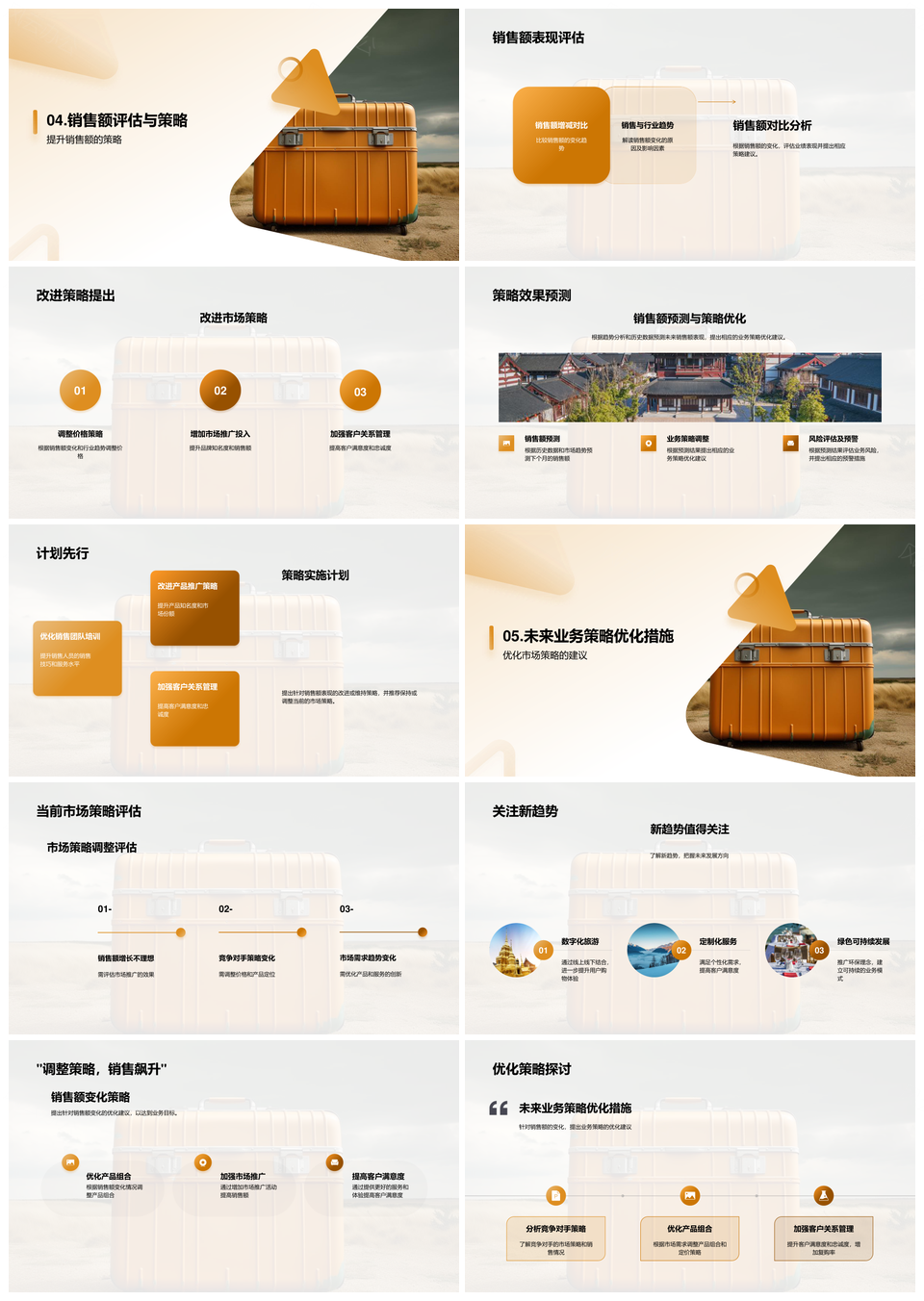 这是一张旅游业务旅行箱销售趋势月度策略优化分析PPT模板,包含旅游业务、旅行箱、销售趋势、月度策略、优化分析等主题内容,也可用作旅游业务旅行箱销售、业务旅行箱销售趋势、旅行箱销售趋势月度、销售趋势月度策略、趋势月度策略优化、月度策略优化分析、旅游业务旅行箱、业务旅行箱销售、旅行箱销售趋势、销售趋势月度、趋势月度策略、月度策略优化、策略优化分析、旅游业务、业务旅行箱等PPT场景使用。 风云办公提供的旅游业务旅行箱销售趋势月度策略优化分析PPT模板,下载格式为pptx,一共28页,作品中文字及图均可以修改和编辑,图片更改请在作品中右键图片并更换,文字修改请直接点击文字进行修改。