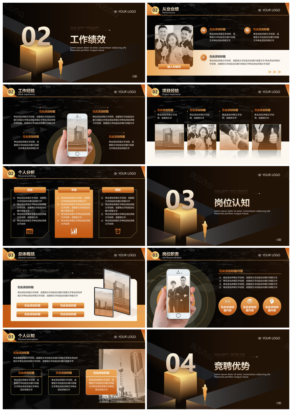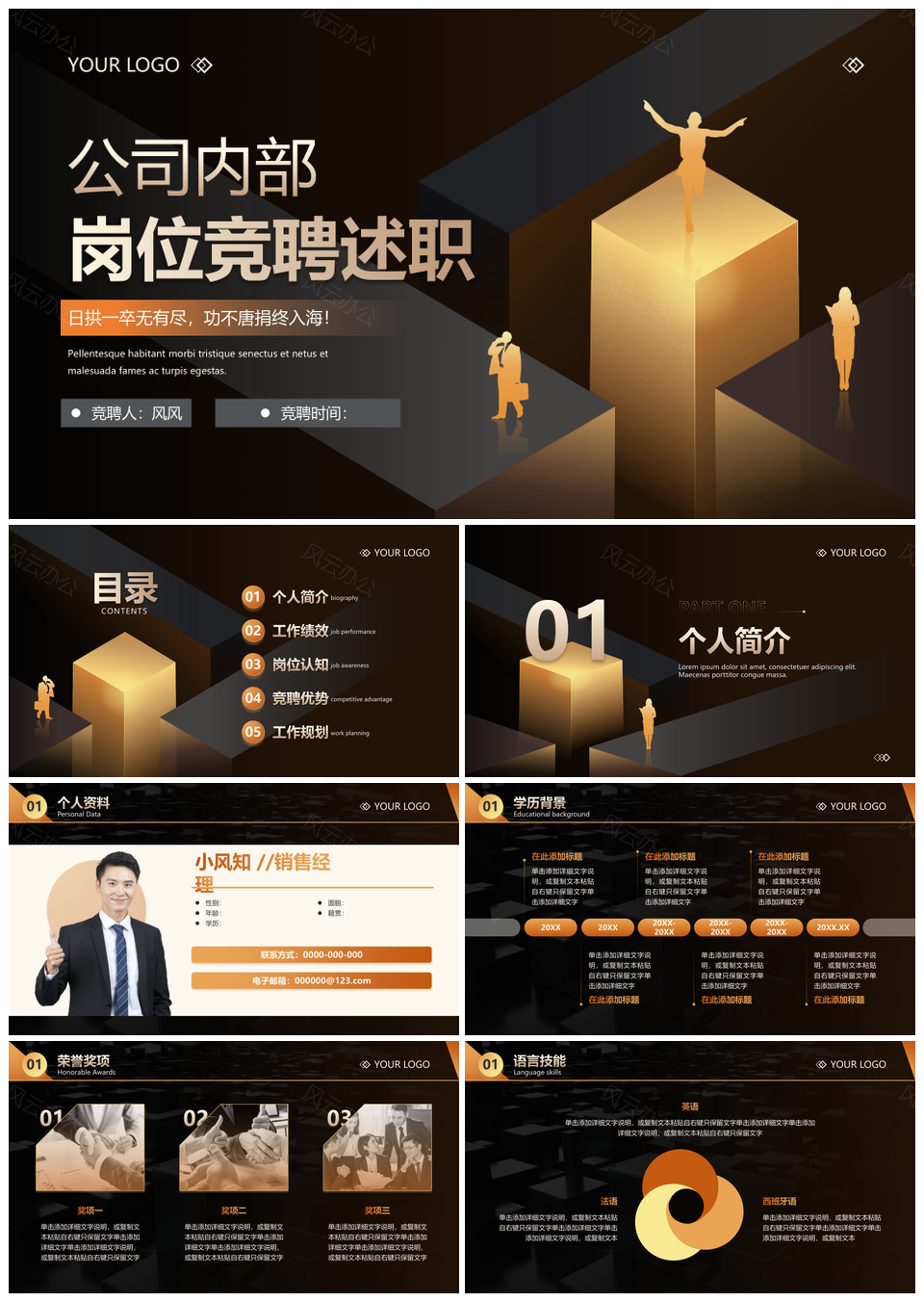 风云办公提供的黑金商务简约风企业员工内部竞聘述职PPT模板,下载格式为pptx,一共25页,作品中文字及图均可以修改和编辑,图片更改请在作品中右键图片并更换,文字修改请直接点击文字进行修改。
