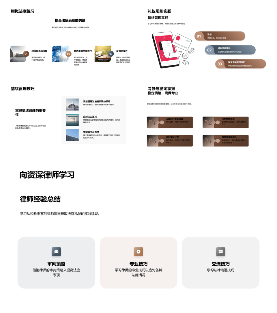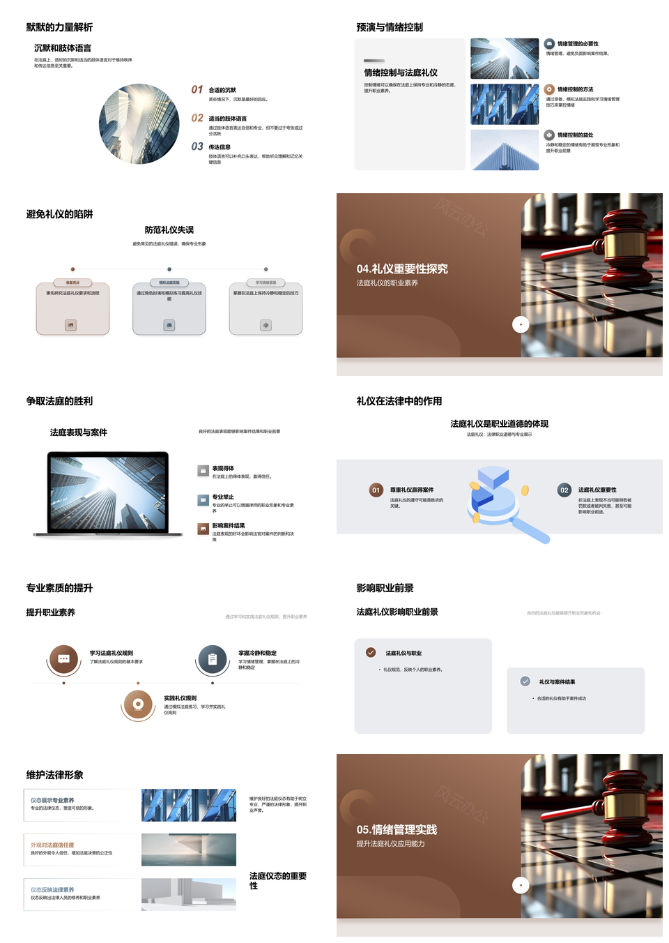 这是一张2025法官律师法庭商务礼仪与情绪管理培训PPT模板,包含2025、法官、律师、法庭、商务礼仪、情绪管理、培训等主题内容,也可用作2025法官律师法庭商务礼仪、法官律师法庭商务礼仪情绪管理、律师法庭商务礼仪情绪管理培训、法庭商务礼仪情绪管理培训、2025法官律师法庭、法官律师法庭商务礼仪、律师法庭商务礼仪情绪管理、法庭商务礼仪情绪管理、商务礼仪情绪管理培训、2025法官律师、法官律师法庭、律师法庭商务礼仪、法庭商务礼仪情绪、商务礼仪情绪管理、情绪管理培训等PPT场景使用。 风云办公提供的2025法官律师法庭商务礼仪与情绪管理培训PPT模板,下载格式为pptx,一共33页,作品中文字及图均可以修改和编辑,图片更改请在作品中右键图片并更换,文字修改请直接点击文字进行修改。