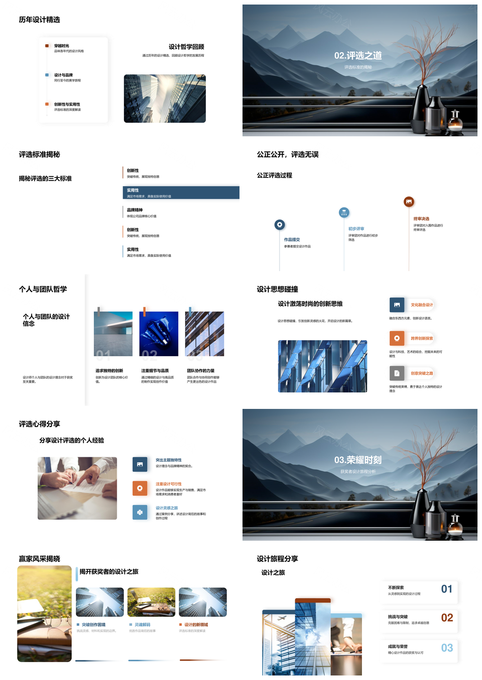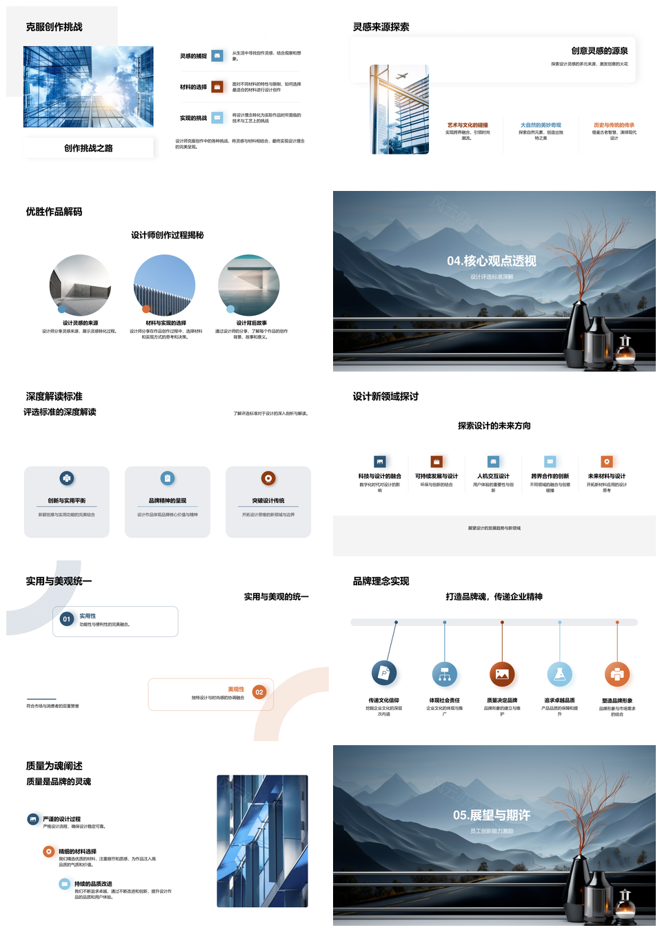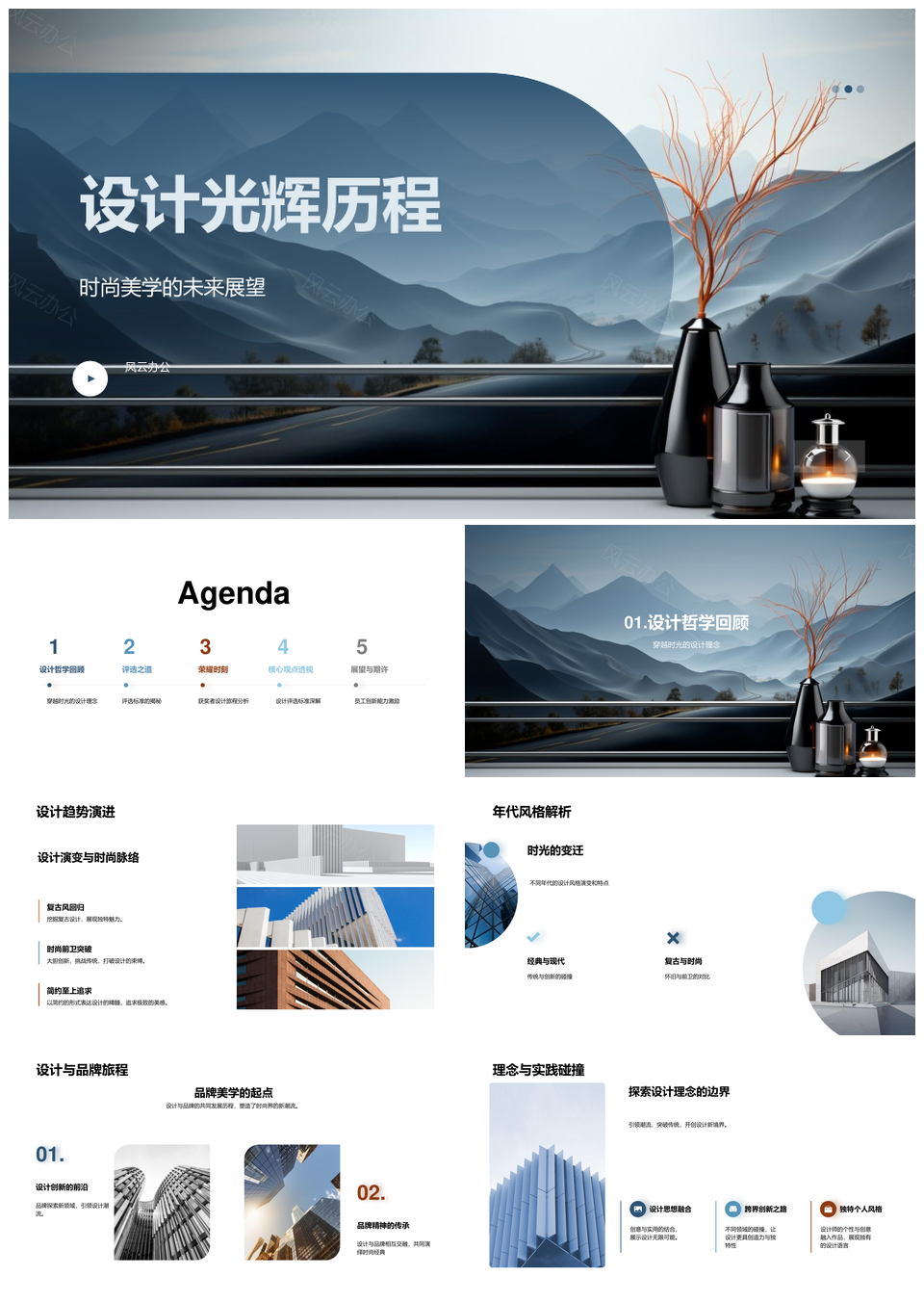 这是一张设计光辉历程美学哲学品牌创新新领域探索PPT模板,包含光辉历程、美学、哲学、品牌、创新、新领域、探索等主题内容,也可用作设计光辉历程美学、光辉历程美学哲学、美学哲学品牌创新、哲学品牌创新新领域、品牌创新新领域探索、设计光辉历程、光辉历程美学、历程美学哲学、美学哲学品牌、哲学品牌创新、品牌创新新领域、创新新领域探索、设计光辉、光辉历程、历程美学等PPT场景使用。 风云办公提供的设计光辉历程美学哲学品牌创新新领域探索PPT模板,下载格式为pptx,一共33页,作品中文字及图均可以修改和编辑,图片更改请在作品中右键图片并更换,文字修改请直接点击文字进行修改。