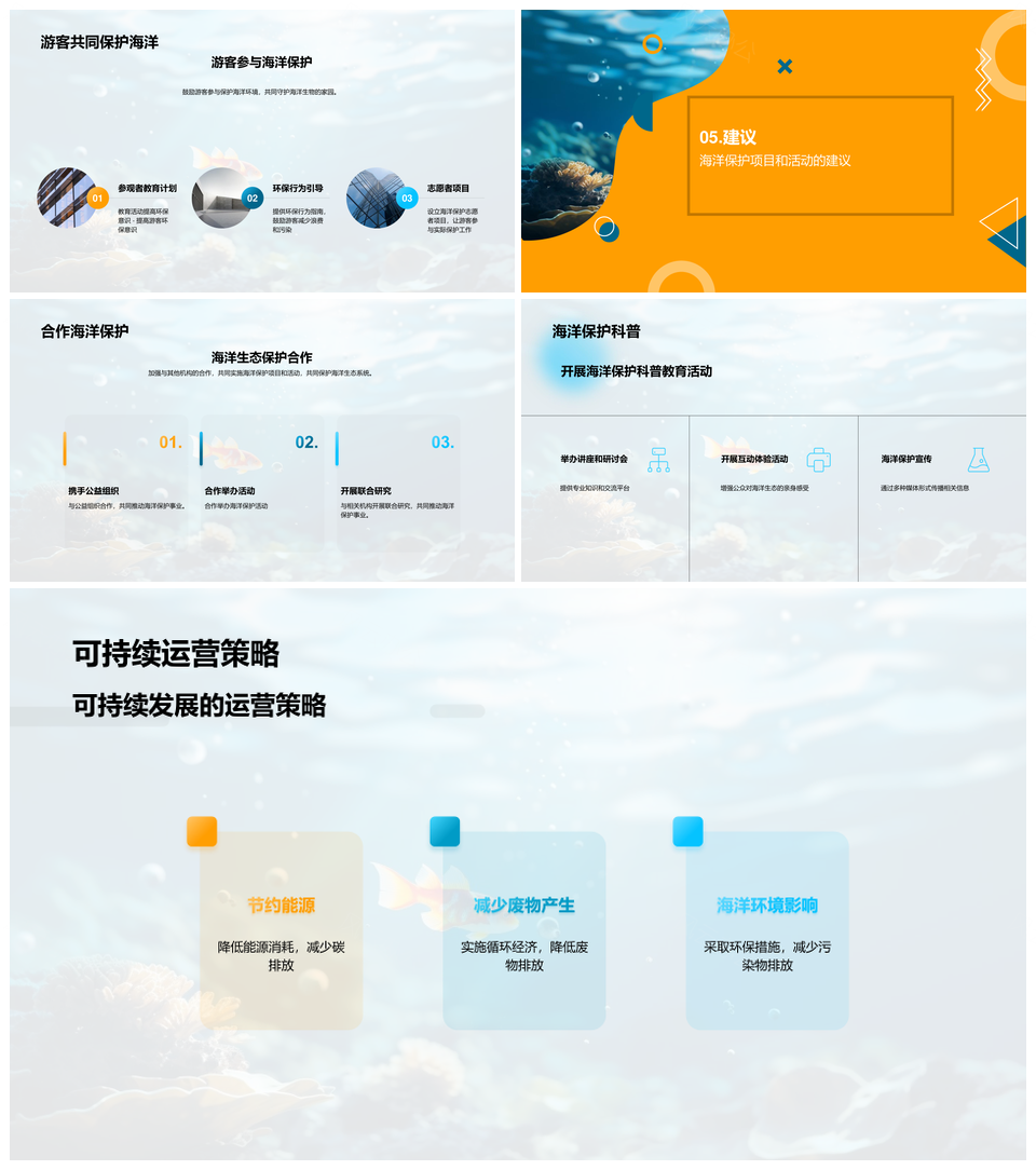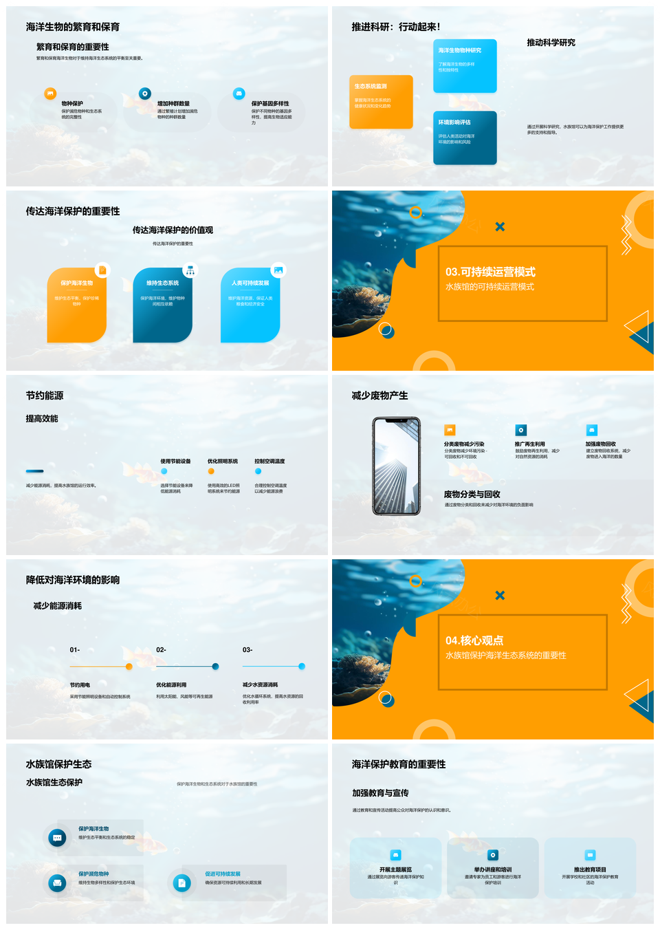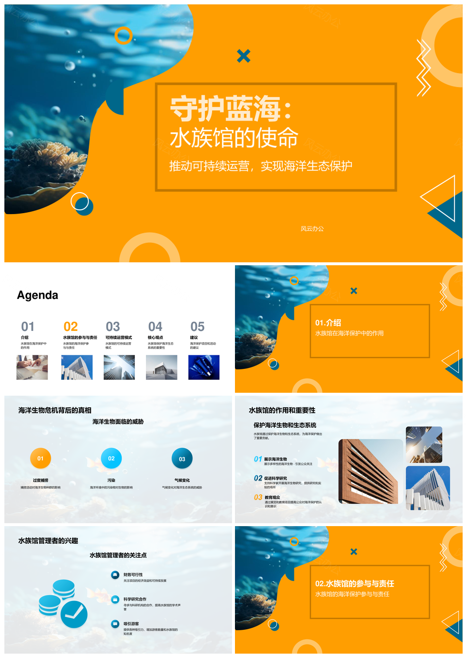 风云办公提供的水族馆守护海洋生态保护使命PPT模板,下载格式为pptx,一共23页,作品中文字及图均可以修改和编辑,图片更改请在作品中右键图片并更换,文字修改请直接点击文字进行修改。