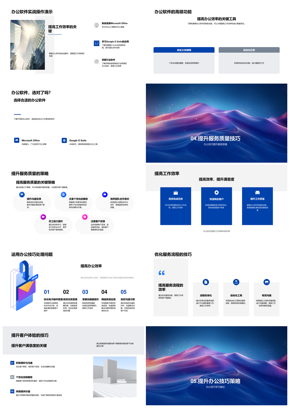 这是一张服务行业企业内训办公技巧快捷键效率培训PPT模板,包含服务行业、企业、内训、办公技巧、快捷键、效率、培训等主题内容,也可用作服务行业企业内训办公技巧、企业内训办公技巧快捷键、办公技巧快捷键效率培训、服务行业企业内训办公、企业内训办公技巧效率、办公技巧效率培训服务、服务行业企业内训培训、行业企业内训办公技巧、企业内训快捷键效率、行业办公技巧快捷键、内训办公技巧效率、快捷键效率培训服务、服务行业效率培训、企业办公技巧培训、办公效率培训服务等PPT场景使用。 风云办公提供的服务行业企业内训办公技巧快捷键效率培训PPT模板,下载格式为pptx,一共33页,作品中文字及图均可以修改和编辑,图片更改请在作品中右键图片并更换,文字修改请直接点击文字进行修改。