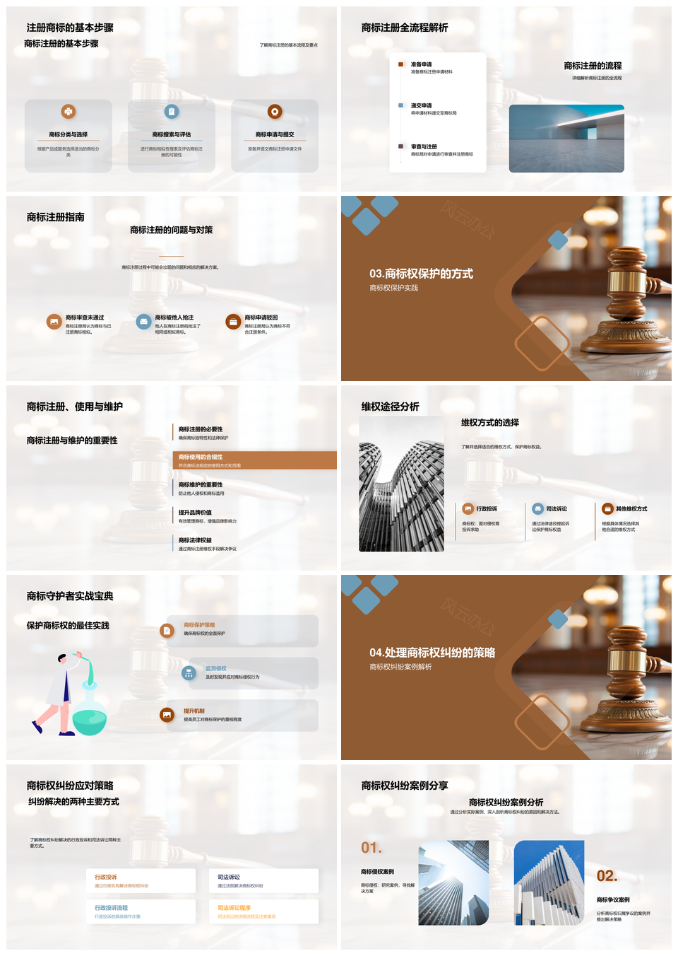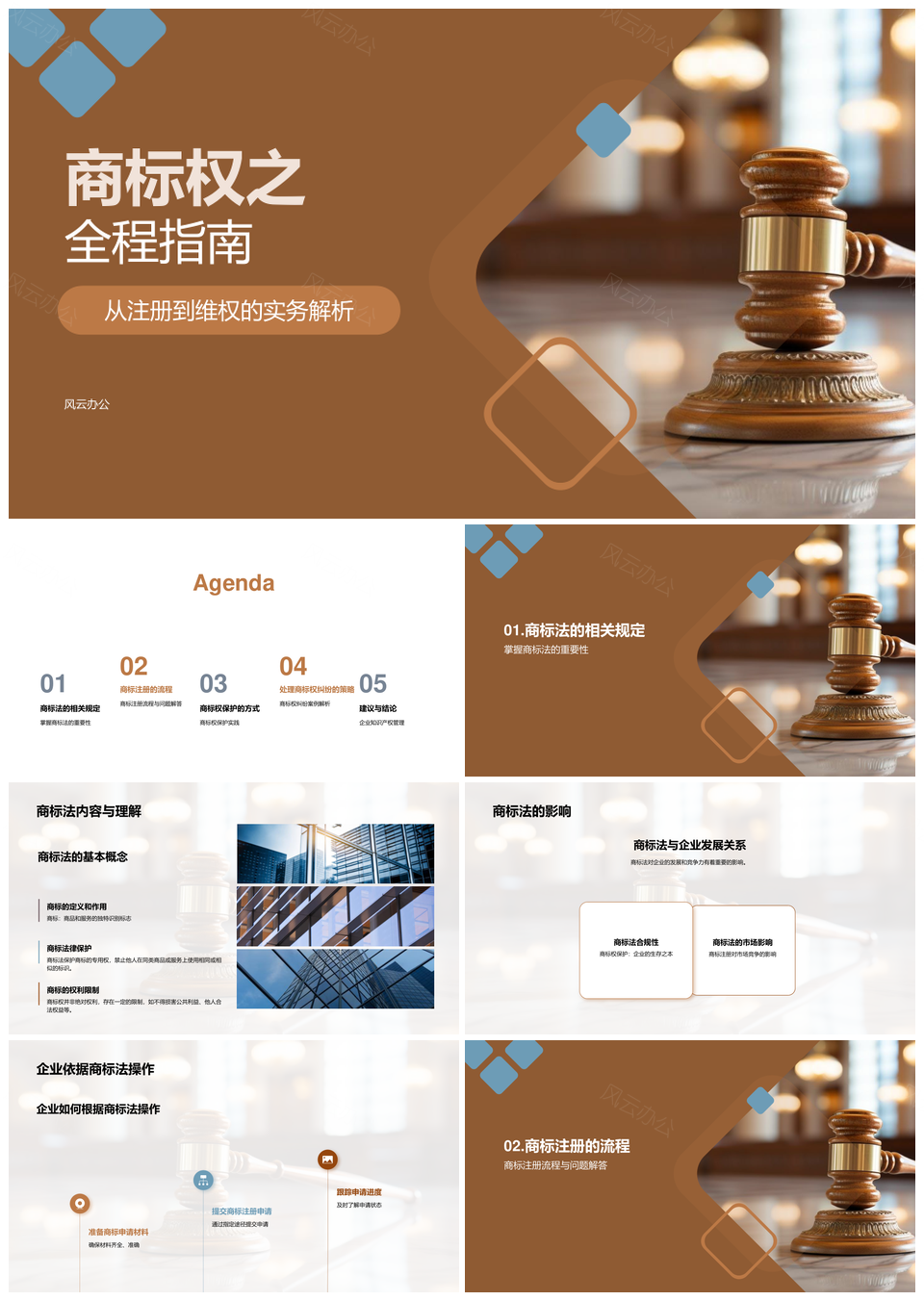 风云办公提供的商标权法注册维权保护全流程PPT模板,下载格式为pptx,一共23页,作品中文字及图均可以修改和编辑,图片更改请在作品中右键图片并更换,文字修改请直接点击文字进行修改。