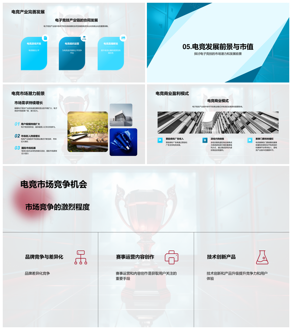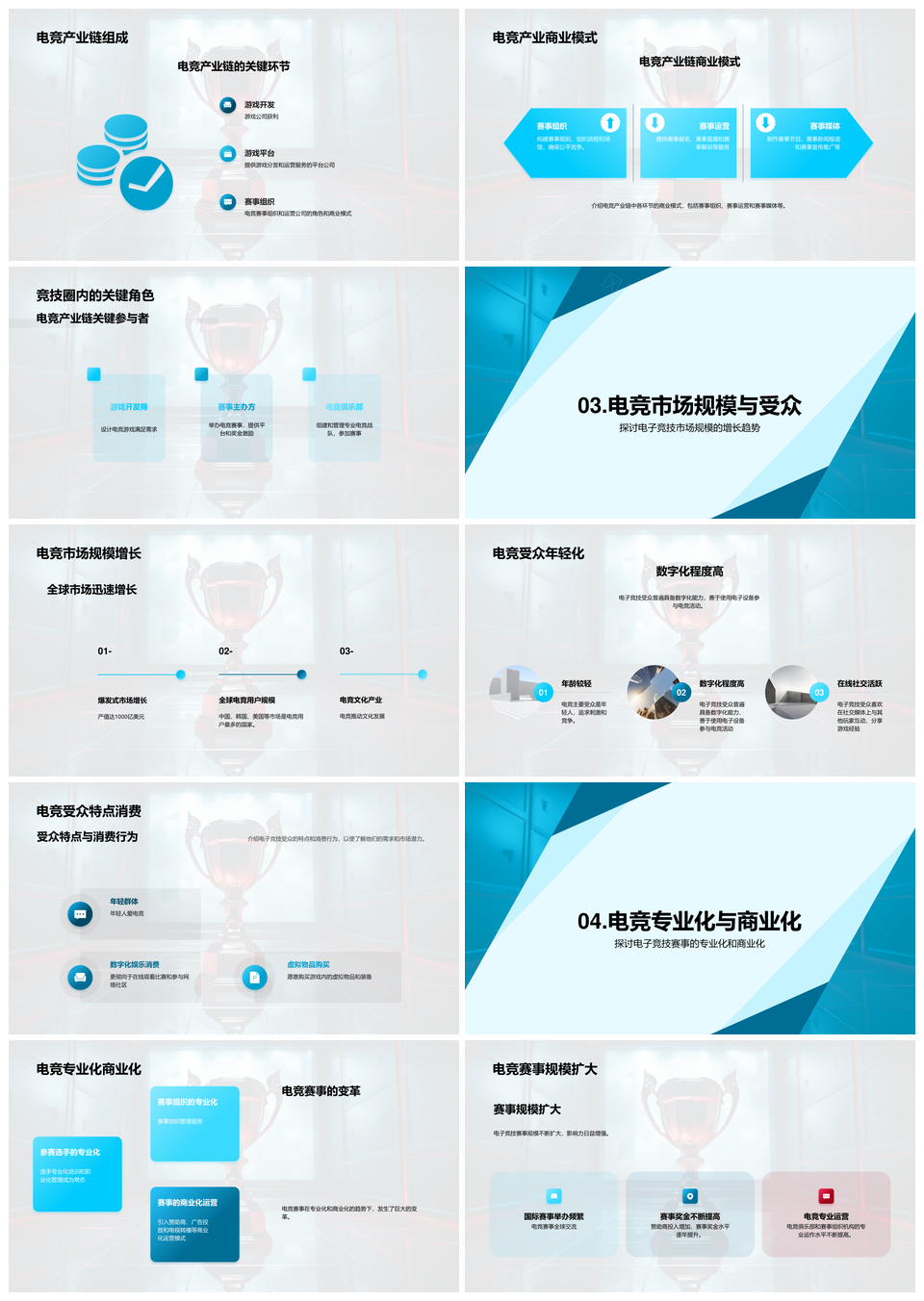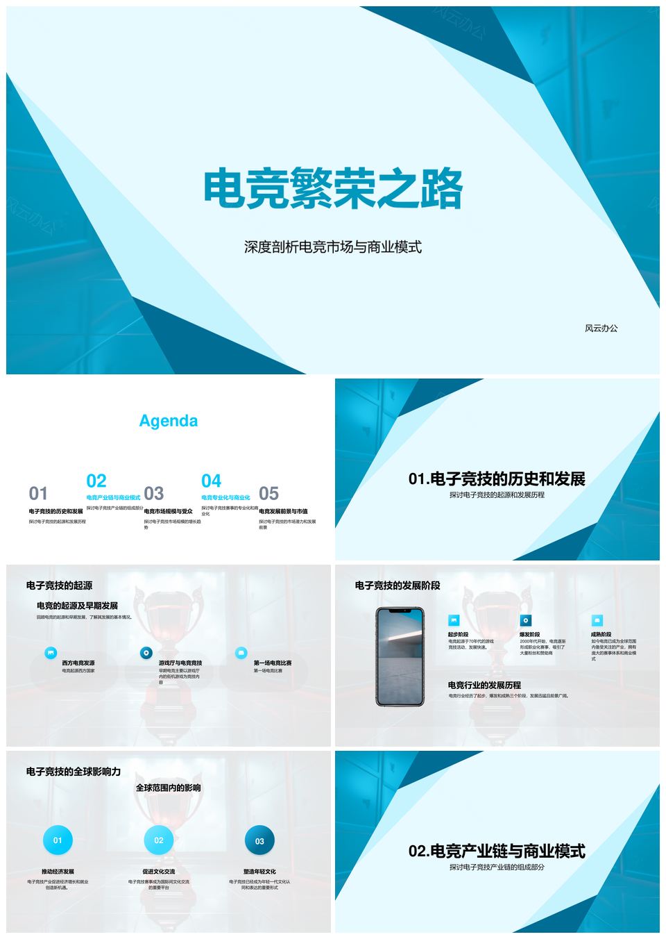 风云办公提供的电竞产业链发展趋势与商业模式分析PPT模板,下载格式为pptx,一共23页,作品中文字及图均可以修改和编辑,图片更改请在作品中右键图片并更换,文字修改请直接点击文字进行修改。