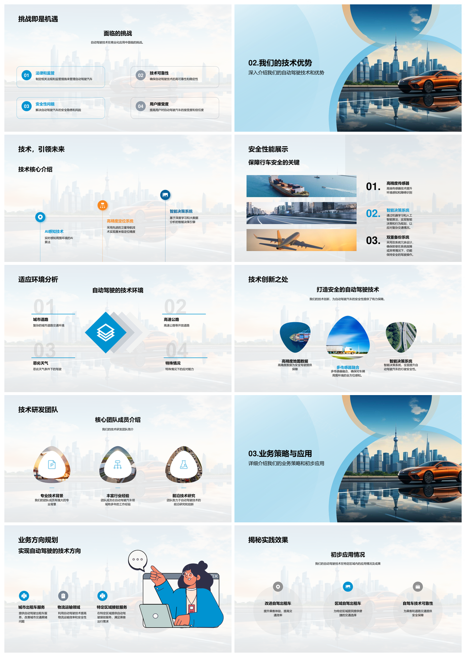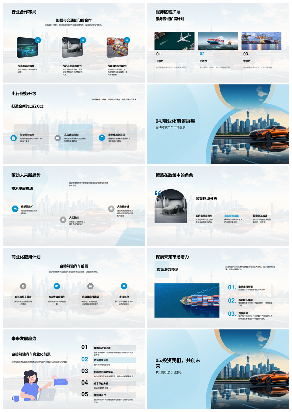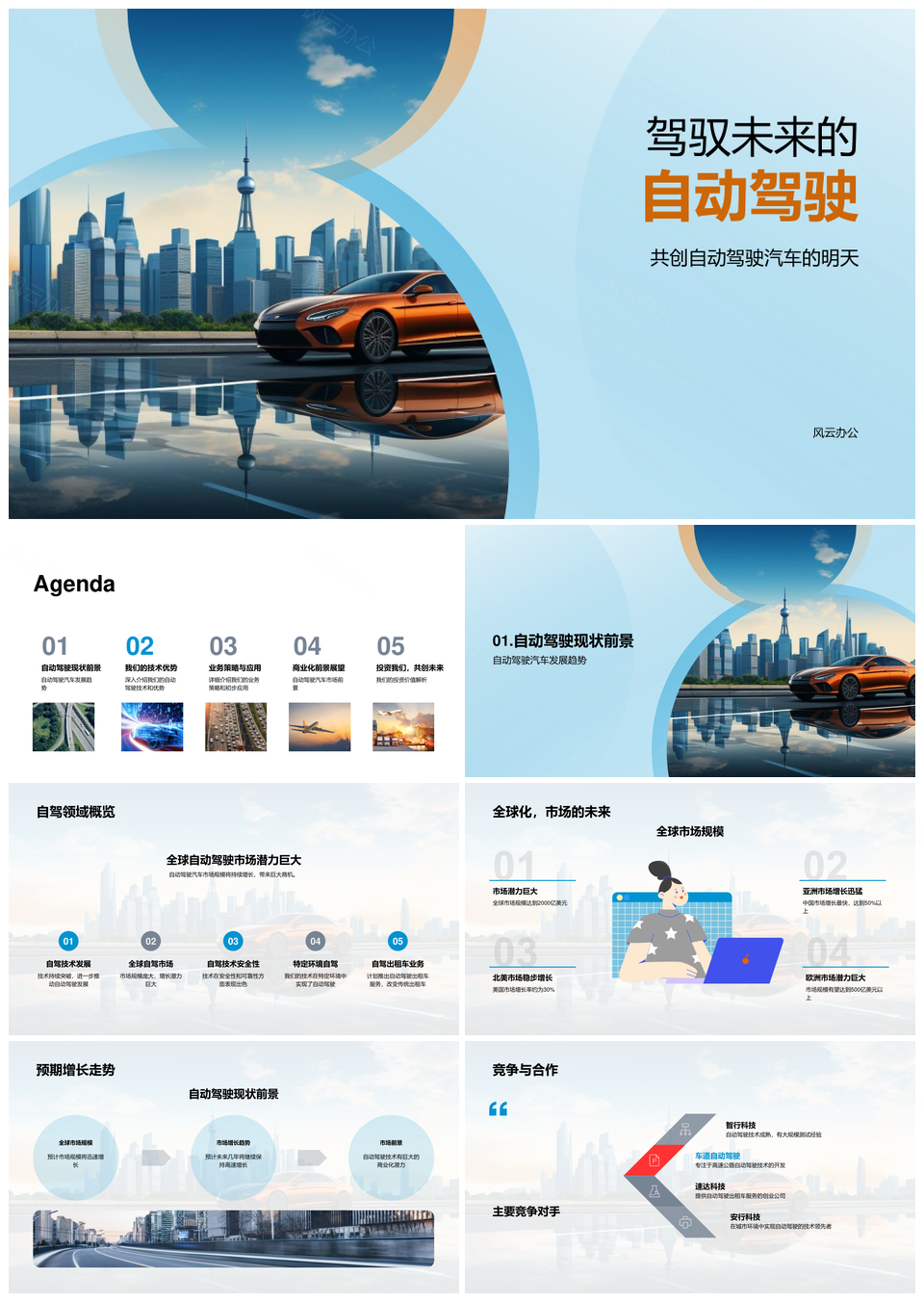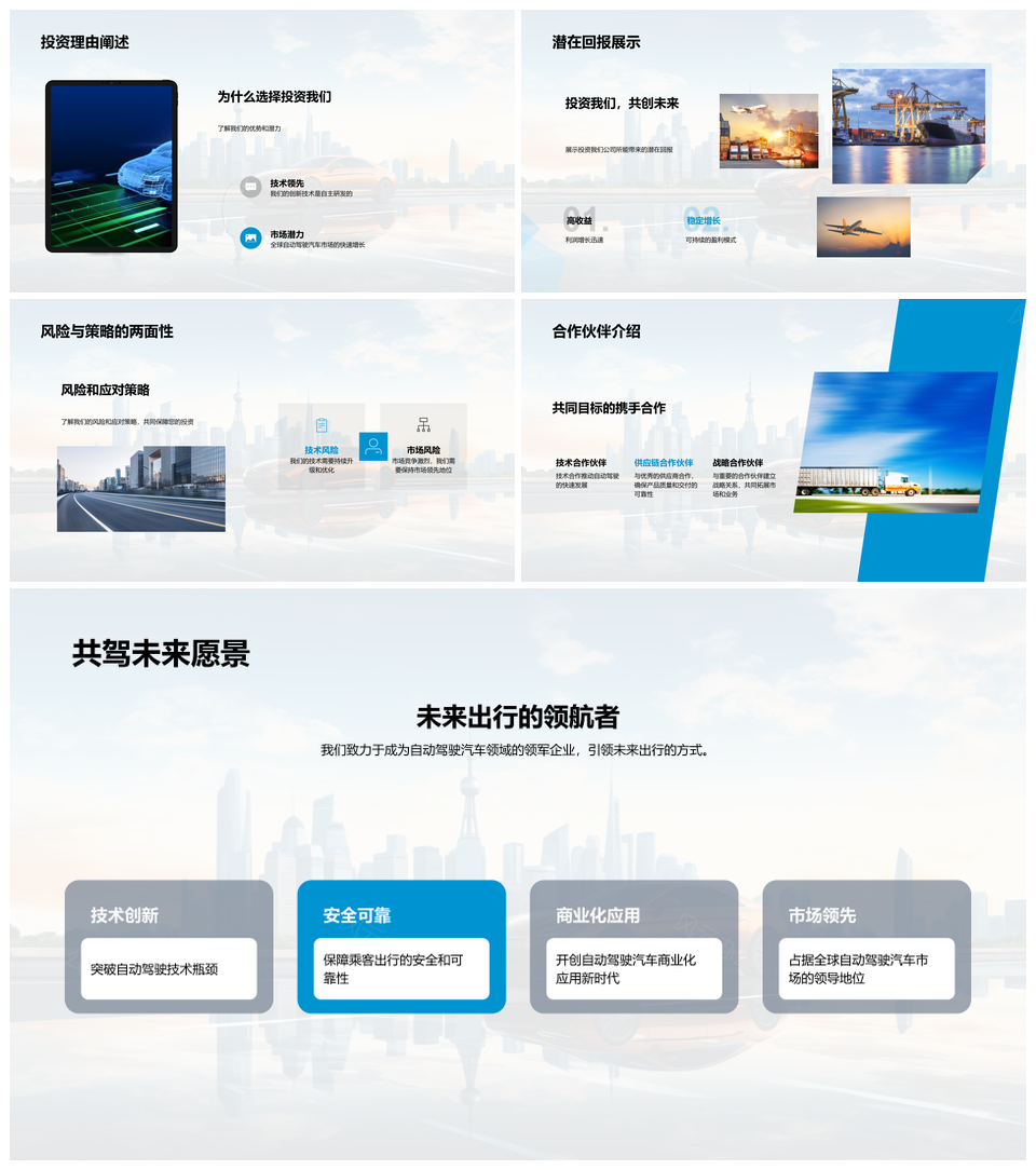 这是一张自动驾驶投资创业公司角逐全球安全技术创新商业化PPT模板,包含自动驾驶、投资、创业公司、角逐、全球、安全、技术、创新、商业化等主题内容,也可用作自动驾驶安全技术创新商业化、全球安全技术创新商业化、投资创业公司角逐全球、角逐全球安全技术创新、创业公司角逐全球安全技术、自动驾驶投资创业公司、投资创业公司角逐、创业公司角逐全球、角逐全球安全技术、全球安全技术创新、安全技术创新商业化、自动驾驶创业公司角逐、自动驾驶投资、创新商业化、全球安全技术等PPT场景使用。 风云办公提供的自动驾驶投资创业公司角逐全球安全技术创新商业化PPT模板,下载格式为pptx,一共33页,作品中文字及图均可以修改和编辑,图片更改请在作品中右键图片并更换,文字修改请直接点击文字进行修改。