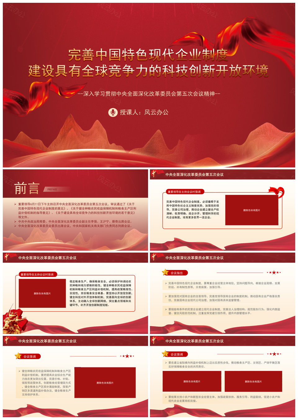 风云办公提供的中央深改委第五次会议学习PPT课件,下载格式为pptx,一共9页,作品中文字及图均可以修改和编辑,图片更改请在作品中右键图片并更换,文字修改请直接点击文字进行修改。