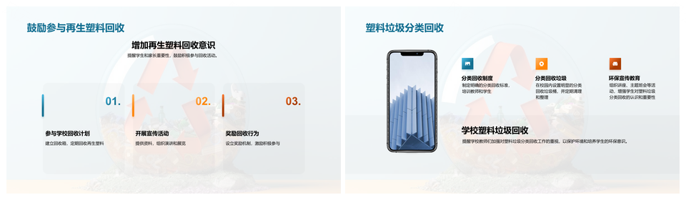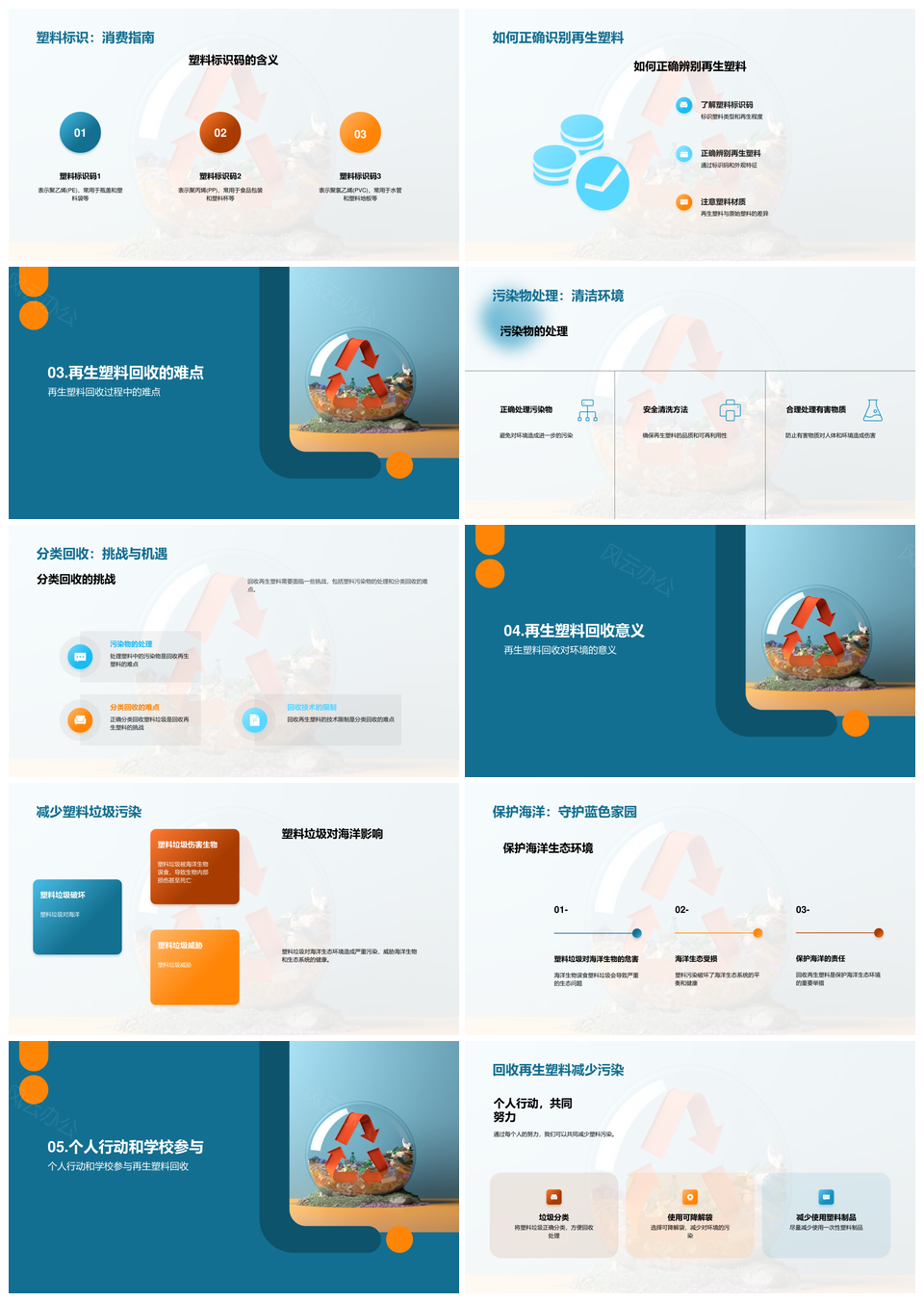 这是一张六年级师生共学再生塑料标识回收环保教育PPT模板,包含六年级、师生、共学、再生塑料、标识、回收、环保教育等主题内容,也可用作六年级师生共学再生塑料、师生共学再生塑料标识、共学再生塑料标识回收、再生塑料标识回收环保教育、六年级师生共学、师生共学再生塑料、共学再生塑料标识、再生塑料标识回收、标识回收环保教育、六年级师生、师生共学、共学再生塑料、再生塑料标识、标识回收、回收环保教育等PPT场景使用。 风云办公提供的六年级师生共学再生塑料标识回收环保教育PPT模板,下载格式为pptx,一共20页,作品中文字及图均可以修改和编辑,图片更改请在作品中右键图片并更换,文字修改请直接点击文字进行修改。