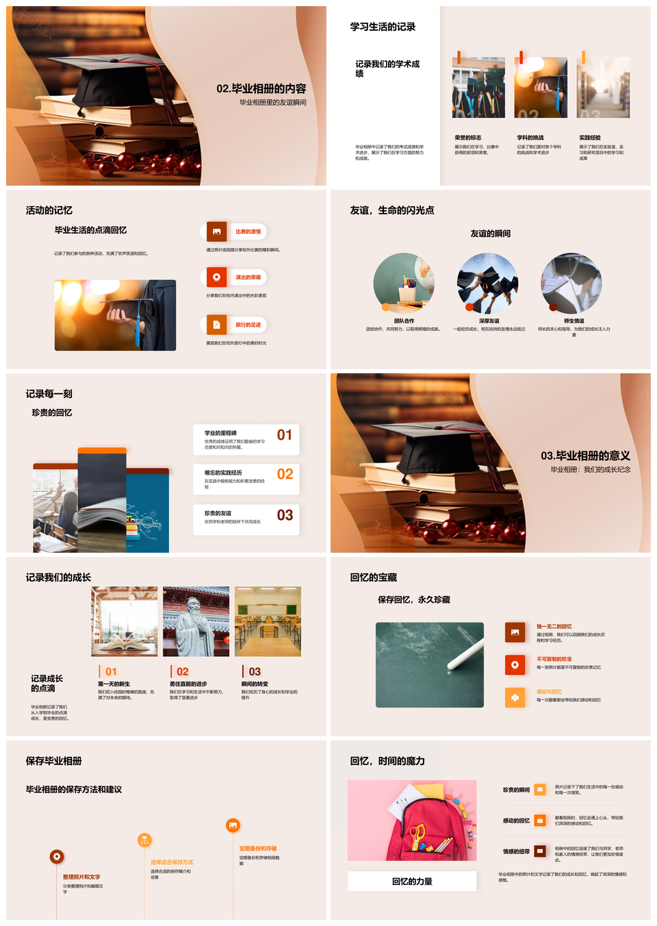 这是一张毕业相册成长记忆学业友谊活动瞬间PPT模板,包含毕业相册、成长记忆、学业、友谊、活动瞬间等主题内容,也可用作毕业相册成长记忆、成长记忆学业友谊、学业友谊活动瞬间、毕业相册成长、成长记忆学业、记忆学业友谊、友谊活动瞬间、毕业相册、成长记忆、学业友谊、活动瞬间、毕业学业、友谊活动、相册成长、毕业成长记忆等PPT场景使用。