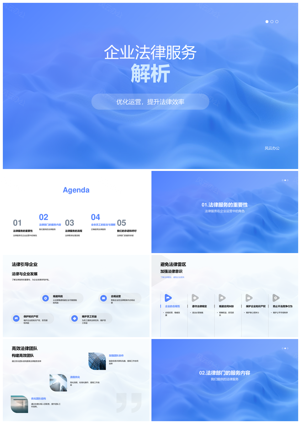 风云办公提供的企业法律服务优化运营法律效率解析PPT模板,下载格式为pptx,一共23页,作品中文字及图均可以修改和编辑,图片更改请在作品中右键图片并更换,文字修改请直接点击文字进行修改。