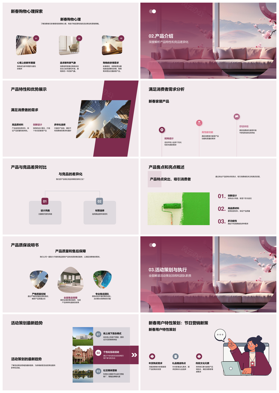 这是一张新春家居樱花树营销策略产品优势活动策划合作推广增销PPT模板,包含新春、家居、樱花树、营销策略、产品优势、活动策划、合作推广、增销等主题内容,也可用作新春家居樱花树营销策略、营销策略产品优势活动策划、产品优势活动策划合作推广、活动策划合作推广增销、家居樱花树产品优势、樱花树营销策略增销、活动策划合作推广、新春家居增销、樱花树产品优势、合作推广增销、家居樱花树、产品优势活动策划、营销策略合作推广、活动策划增销、樱花树营销策略等PPT场景使用。 风云办公提供的新春家居樱花树营销策略产品优势活动策划合作推广增销PPT模板,下载格式为pptx,一共33页,作品中文字及图均可以修改和编辑,图片更改请在作品中右键图片并更换,文字修改请直接点击文字进行修改。