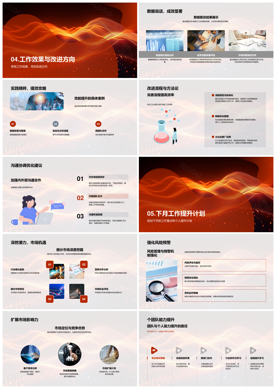 这款模板以正红与酒红为主色调,搭配细腻的肌理质感,呈现沉稳而富有张力的视觉基调。设计融合创意与实用,使用几何块面切割结构强化层次感,同时加入极简手绘线条打破沉闷,艺术感鲜明。图表模块采用立体折纸风格,通过低饱和度渐变处理确保数据清晰,兼顾专业性与视觉统一。内页设计强调呼吸感,疏密对比平衡商务属性与设计新意。适用于品牌提案、产品发布等需兼顾视觉冲击与逻辑展示的场合,适合追求高效表达的职场场景。