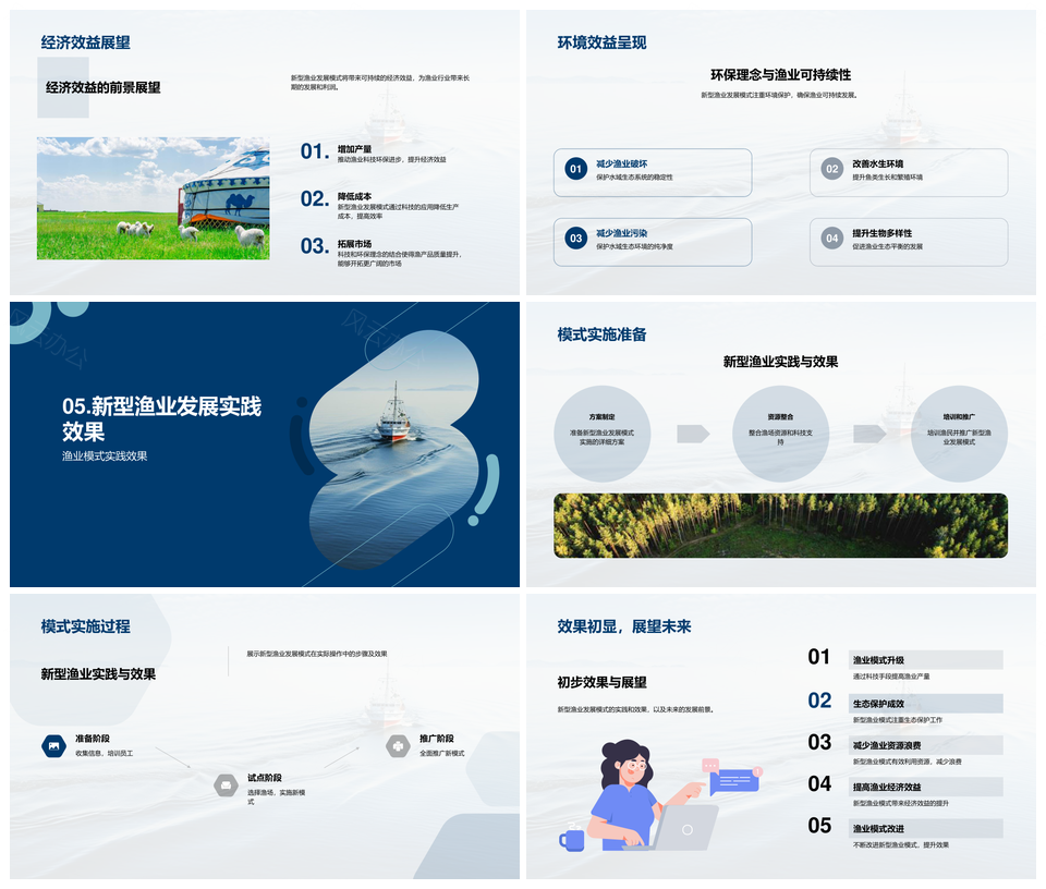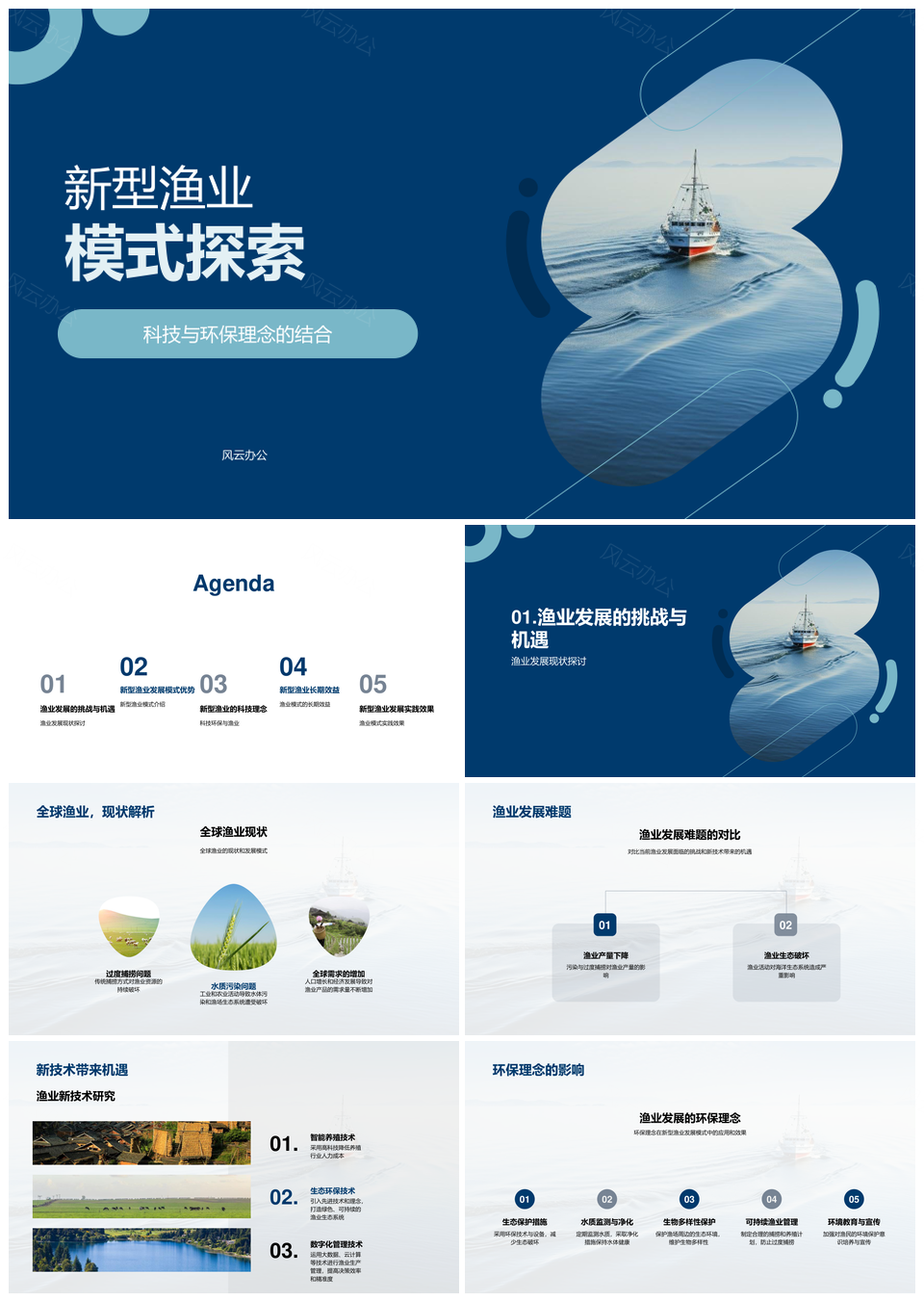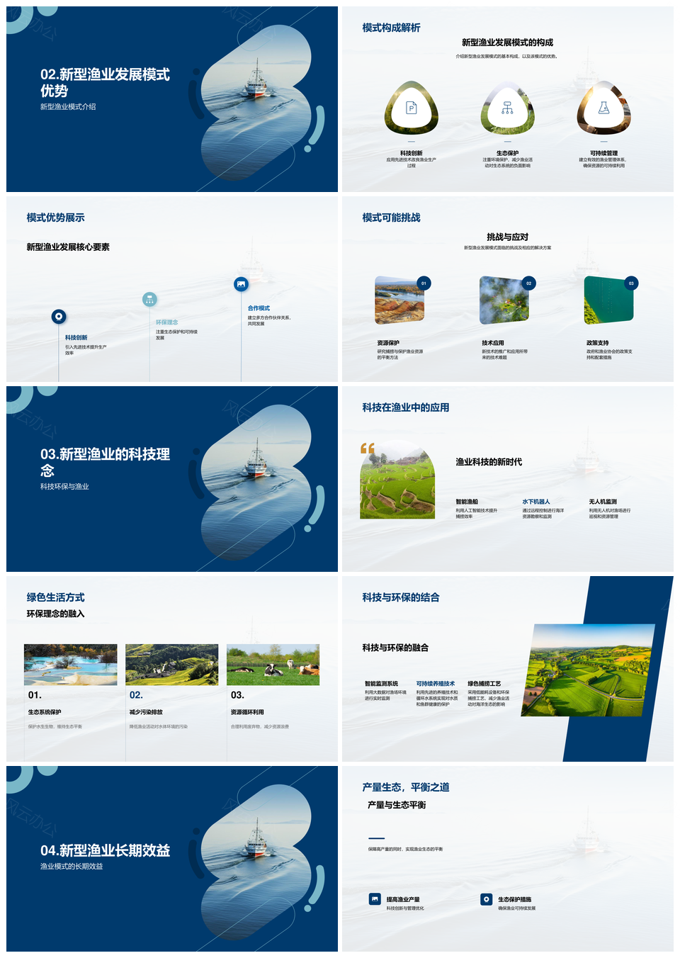 风云办公提供的科技环保驱动新型渔业模式发展PPT模板,下载格式为pptx,一共24页,作品中文字及图均可以修改和编辑,图片更改请在作品中右键图片并更换,文字修改请直接点击文字进行修改。