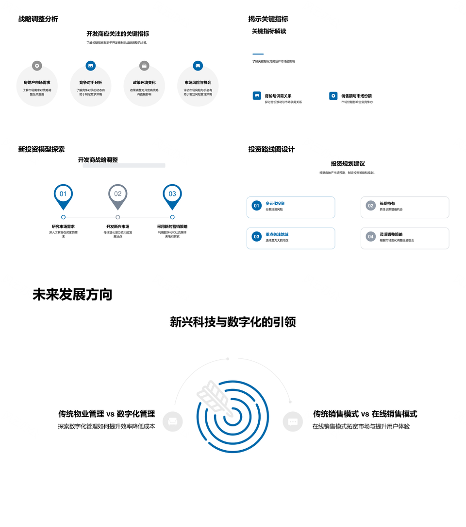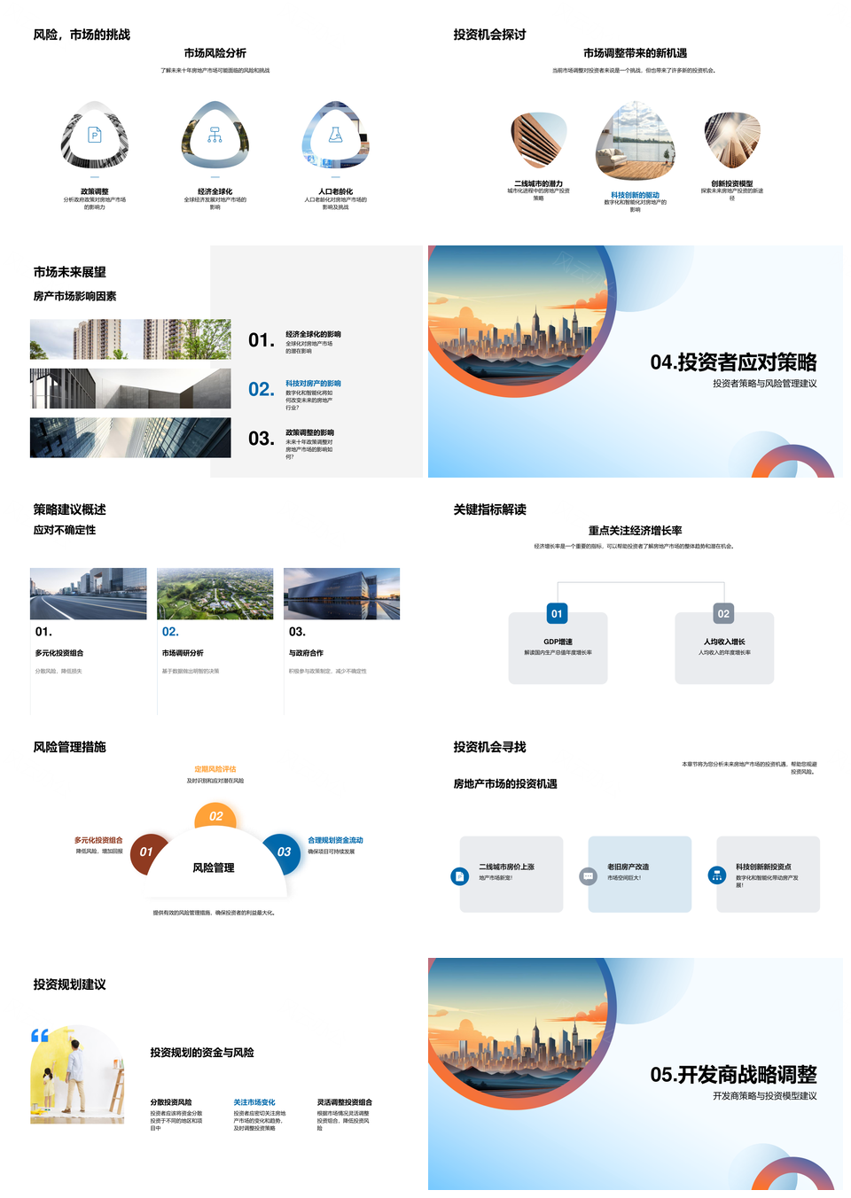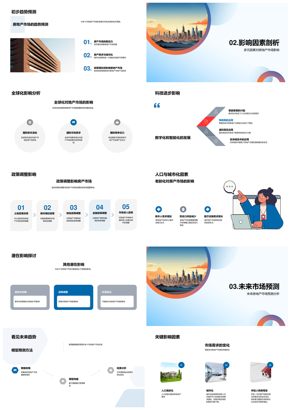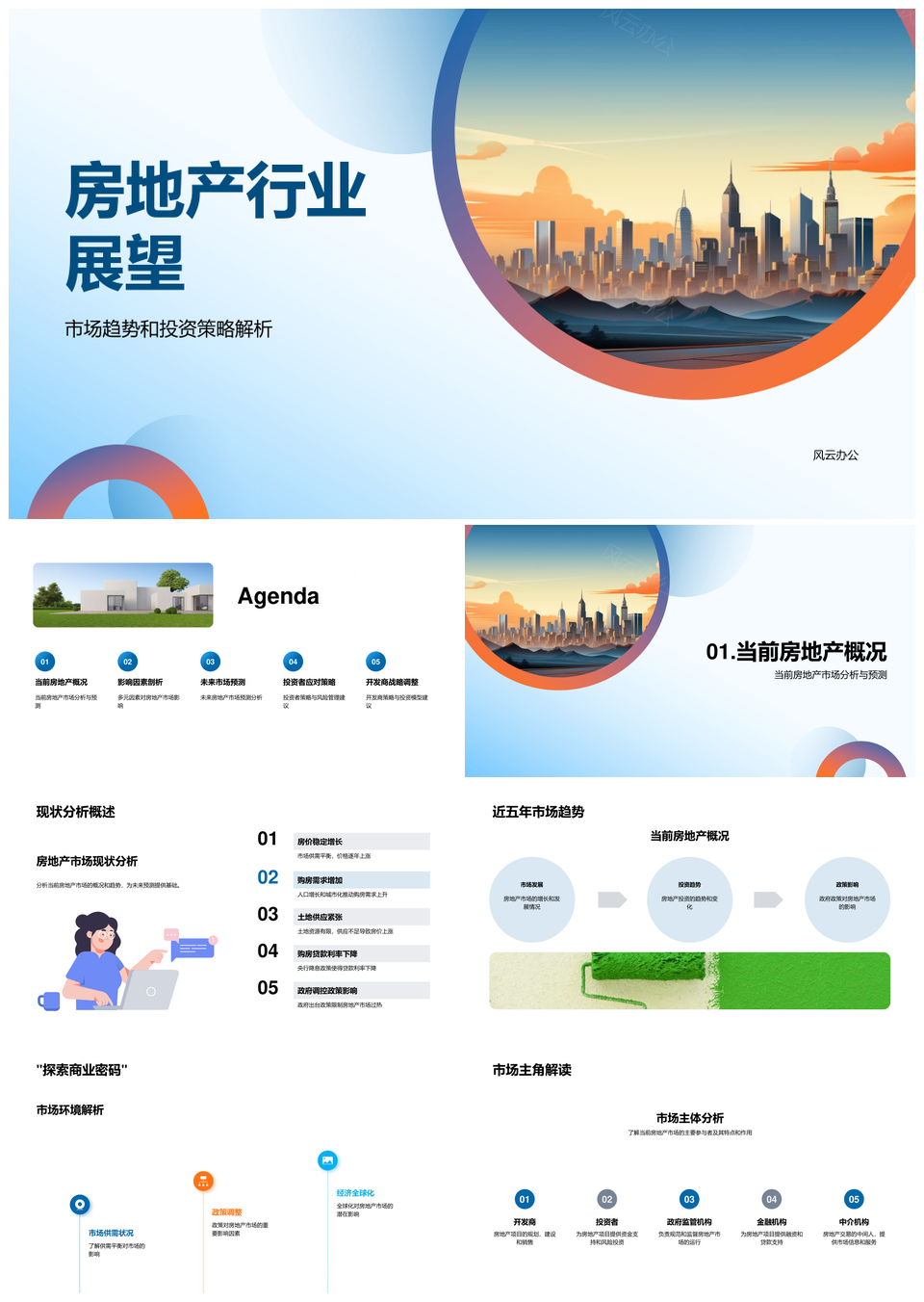 风云办公提供的房地产行业科技趋势与政策投资展望PPT模板,下载格式为pptx,一共33页,作品中文字及图均可以修改和编辑,图片更改请在作品中右键图片并更换,文字修改请直接点击文字进行修改。