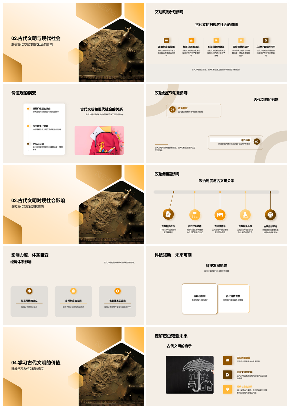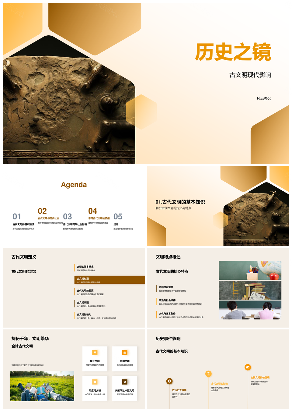 风云办公提供的古代文明映现今世政经科文PPT模板,下载格式为pptx,一共24页,作品中文字及图均可以修改和编辑,图片更改请在作品中右键图片并更换,文字修改请直接点击文字进行修改。