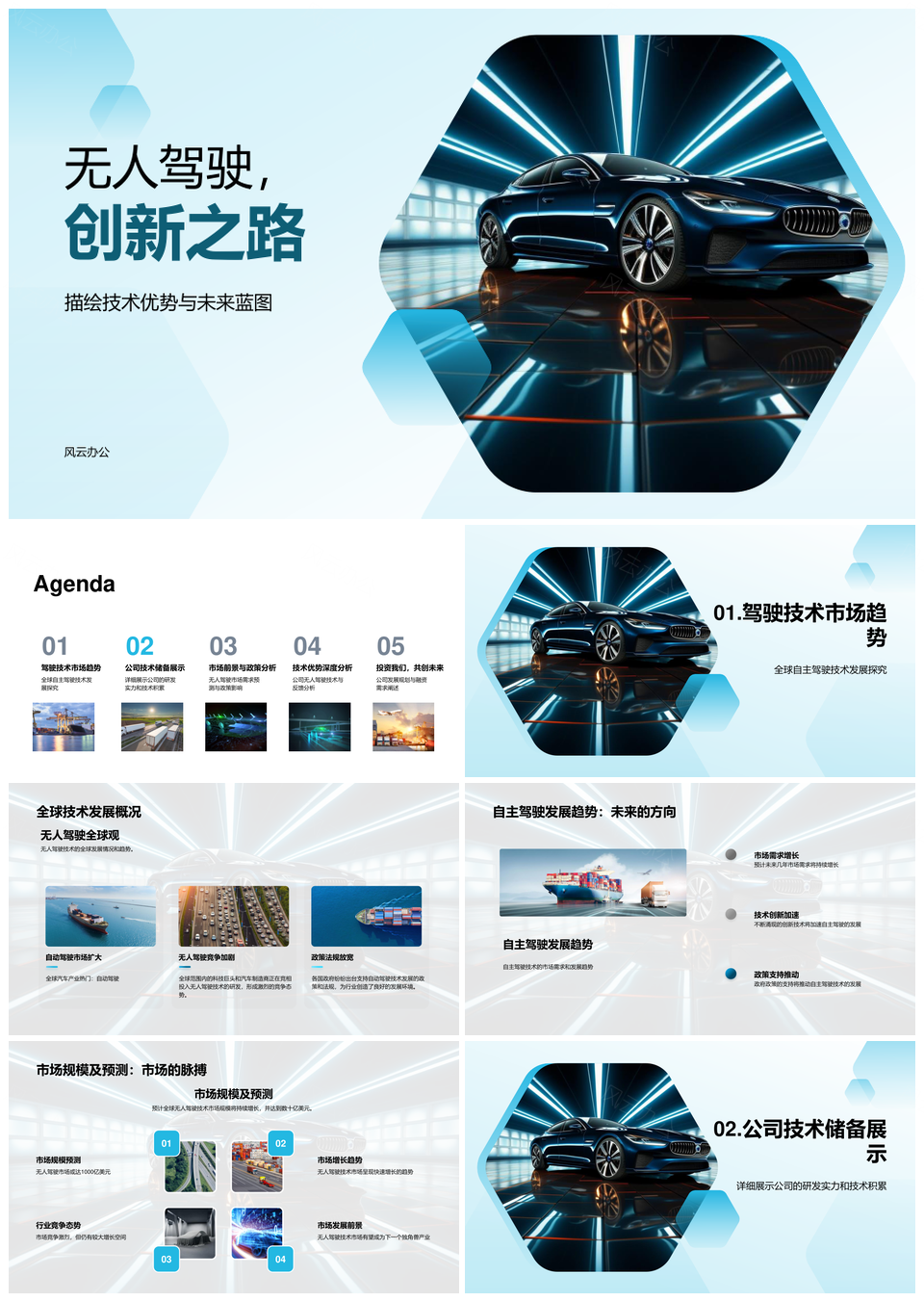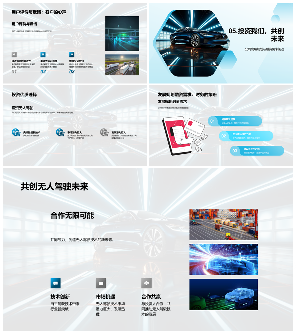 风云办公提供的无人驾驶技术创新融资驱动未来蓝图PPT模板,下载格式为pptx,一共23页,作品中文字及图均可以修改和编辑,图片更改请在作品中右键图片并更换,文字修改请直接点击文字进行修改。