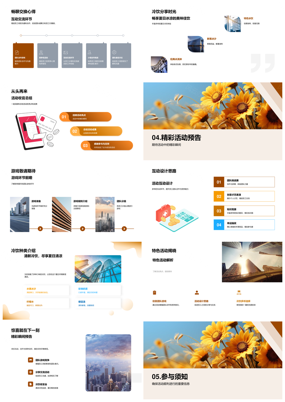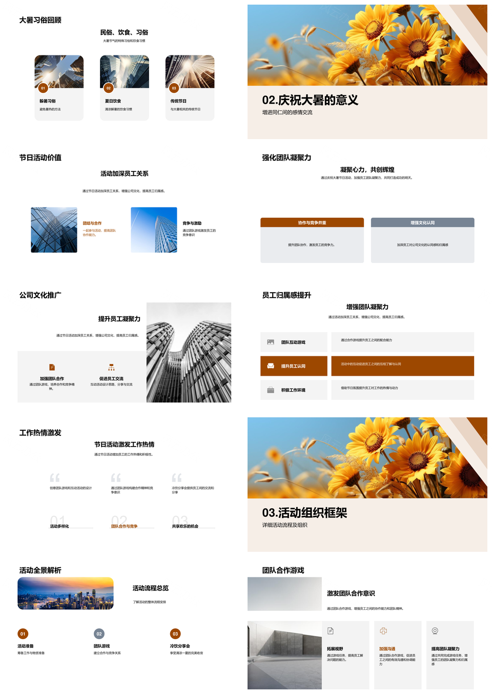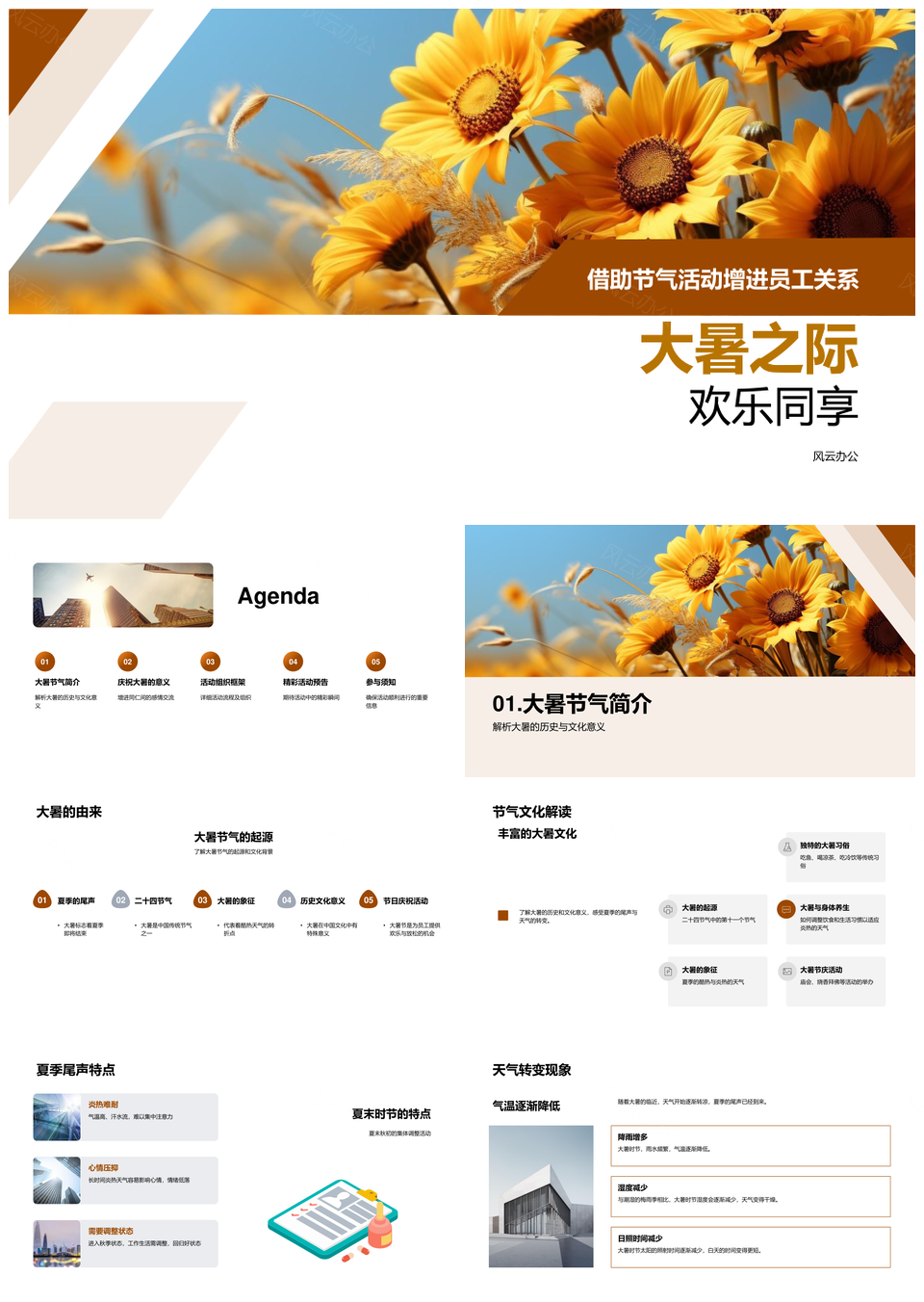 这是一张大暑节气活动员工同乐向阳团队互动增归属PPT模板,包含大暑节气、活动、员工、同乐、向阳团队、互动、归属等主题内容,也可用作大暑节气活动员工同乐、节气活动员工同乐向阳、活动员工同乐向阳团队、员工同乐向阳团队互动、同乐向阳团队互动归属、大暑节气活动员工、大暑节气活动同乐、大暑节气员工同乐、节气活动员工同乐、节气活动同乐向阳、活动员工同乐向阳、活动员工向阳团队、员工同乐向阳团队、同乐向阳团队互动、向阳团队互动归属等PPT场景使用。 风云办公提供的大暑节气活动员工同乐向阳团队互动增归属PPT模板,下载格式为pptx,一共33页,作品中文字及图均可以修改和编辑,图片更改请在作品中右键图片并更换,文字修改请直接点击文字进行修改。