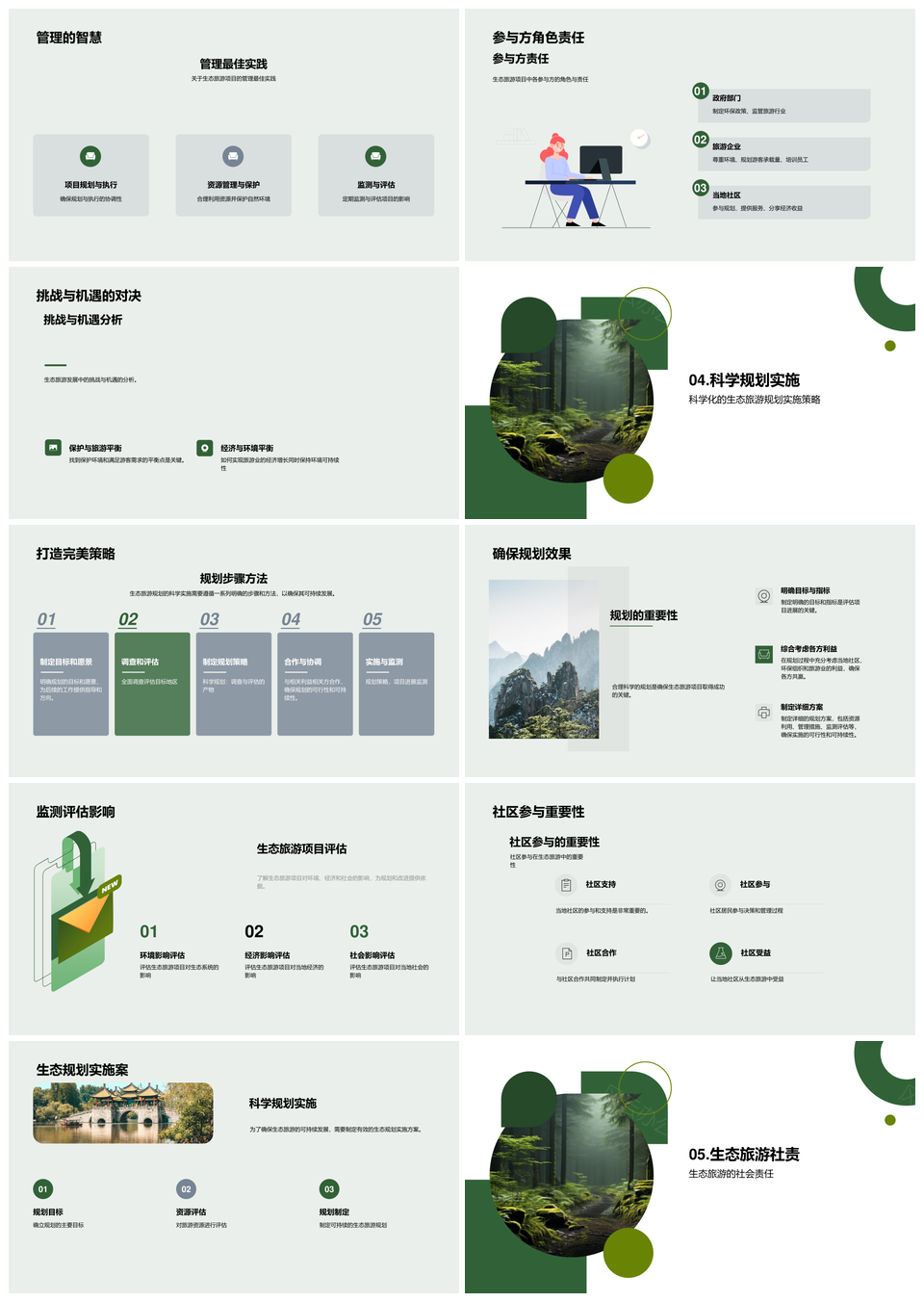 风云办公提供的生态旅游规划可持续发展与自然保护PPT模板,下载格式为pptx,一共33页,作品中文字及图均可以修改和编辑,图片更改请在作品中右键图片并更换,文字修改请直接点击文字进行修改。