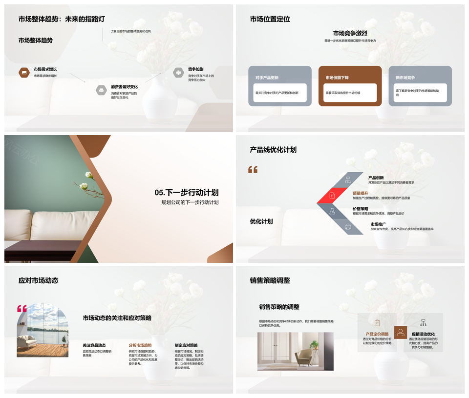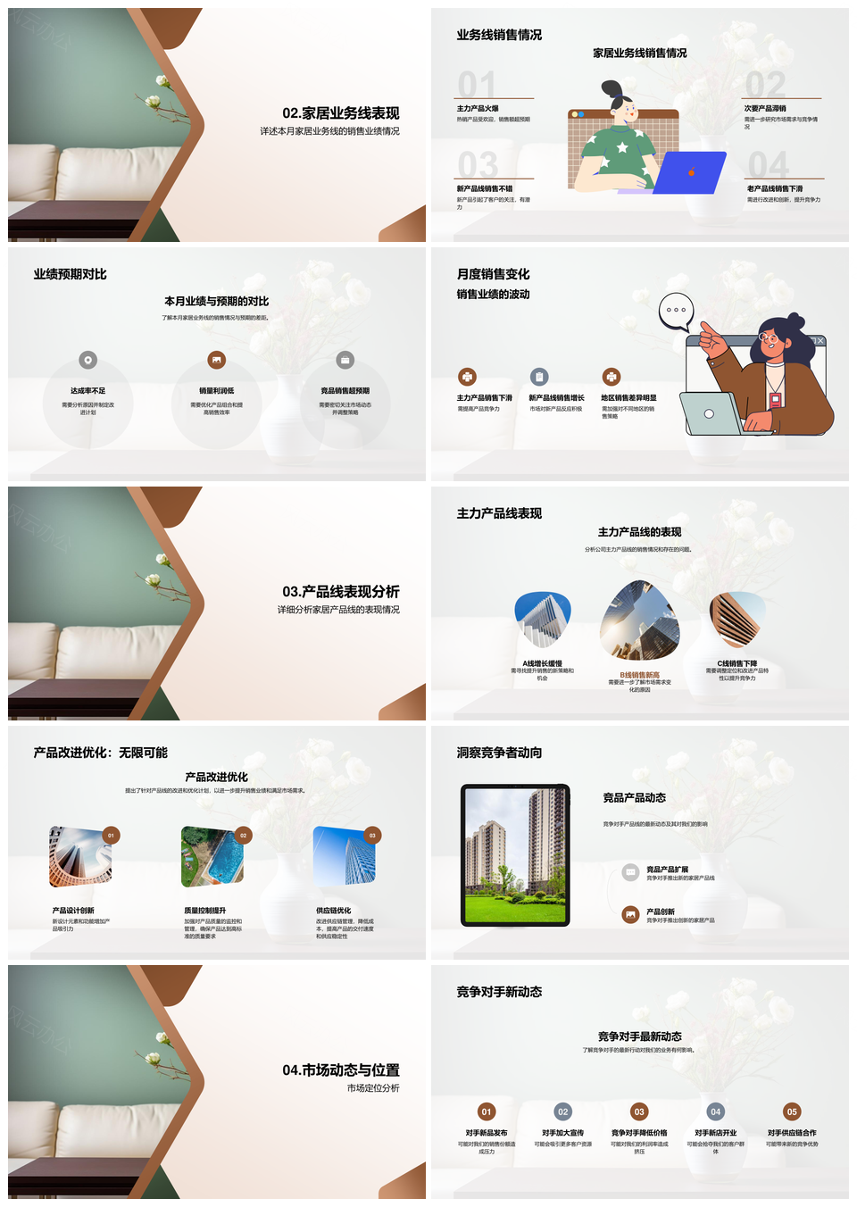 这是一张家居业务月度销售策略调整与产品线优化PPT模板,包含家居业务、月度销售策略、调整、产品线、优化等主题内容,也可用作月度销售策略调整、家居业务产品线优化、销售策略调整优化、业务月度销售策略、策略调整产品线优化、家居业务销售策略、产品线优化调整、月度销售策略、策略调整优化、业务销售策略、家居业务、月度销售、销售策略、策略调整、产品线优化等PPT场景使用。 风云办公提供的家居业务月度销售策略调整与产品线优化PPT模板,下载格式为pptx,一共24页,作品中文字及图均可以修改和编辑,图片更改请在作品中右键图片并更换,文字修改请直接点击文字进行修改。