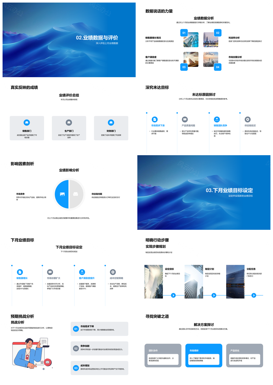 风云办公提供的月度业绩总结规划分析未达标下月目标PPT模板,下载格式为pptx,一共28页,作品中文字及图均可以修改和编辑,图片更改请在作品中右键图片并更换,文字修改请直接点击文字进行修改。