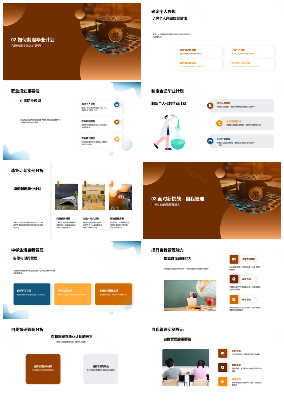 风云办公提供的中学生毕业规划自我管理职业目标PPT模板,下载格式为pptx,一共28页,作品中文字及图均可以修改和编辑,图片更改请在作品中右键图片并更换,文字修改请直接点击文字进行修改。