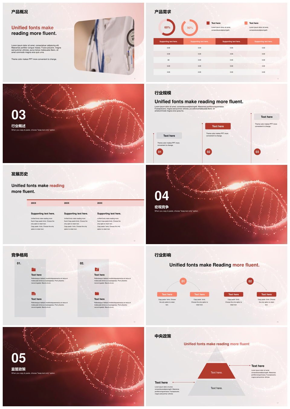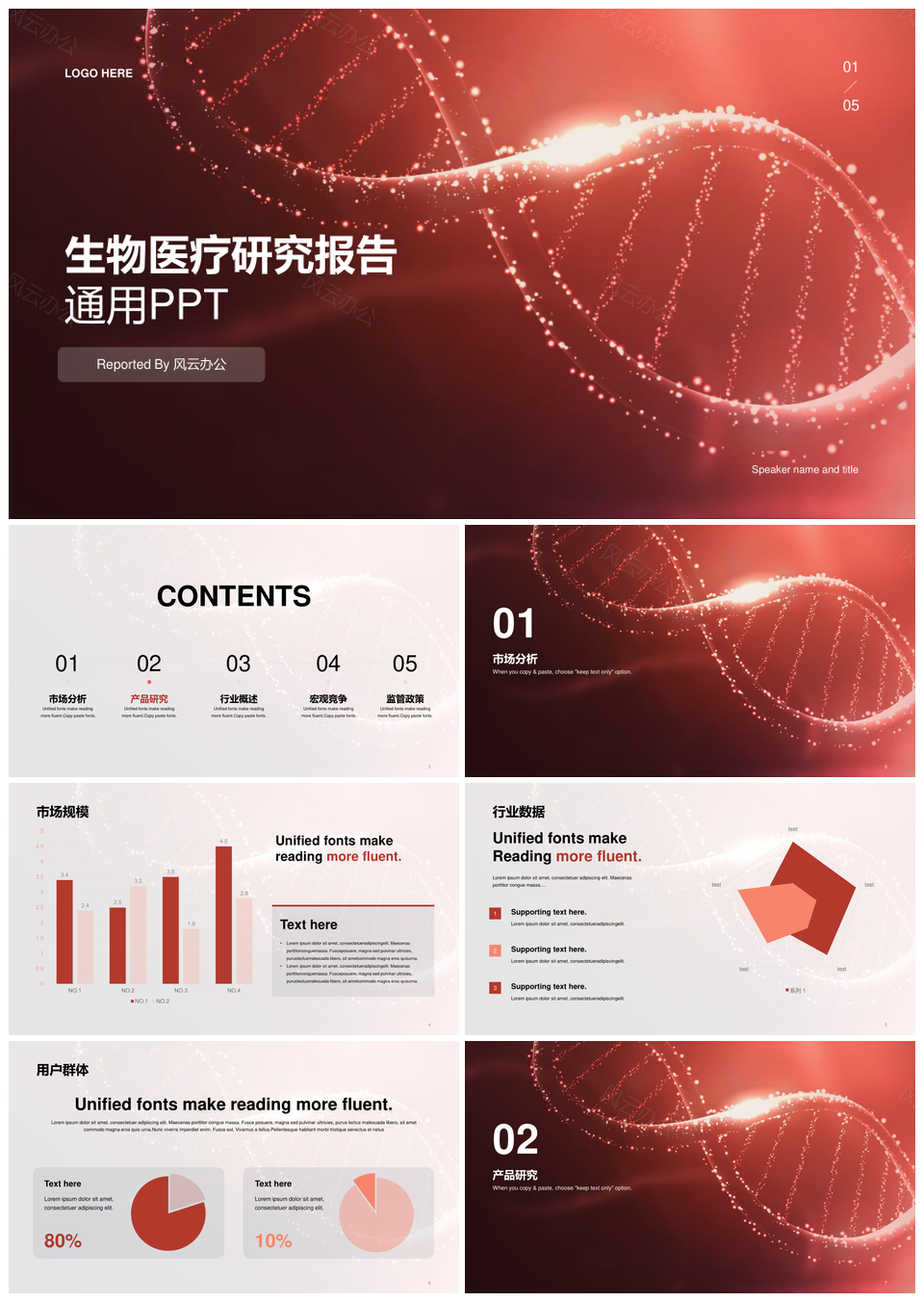 风云办公提供的红色创意炫酷生物医疗基因链研究报告PPT模板,下载格式为pptx,一共19页,作品中文字及图均可以修改和编辑,图片更改请在作品中右键图片并更换,文字修改请直接点击文字进行修改。