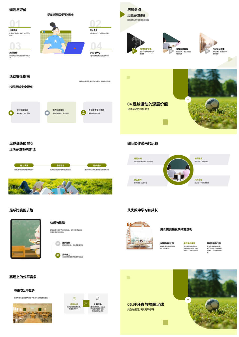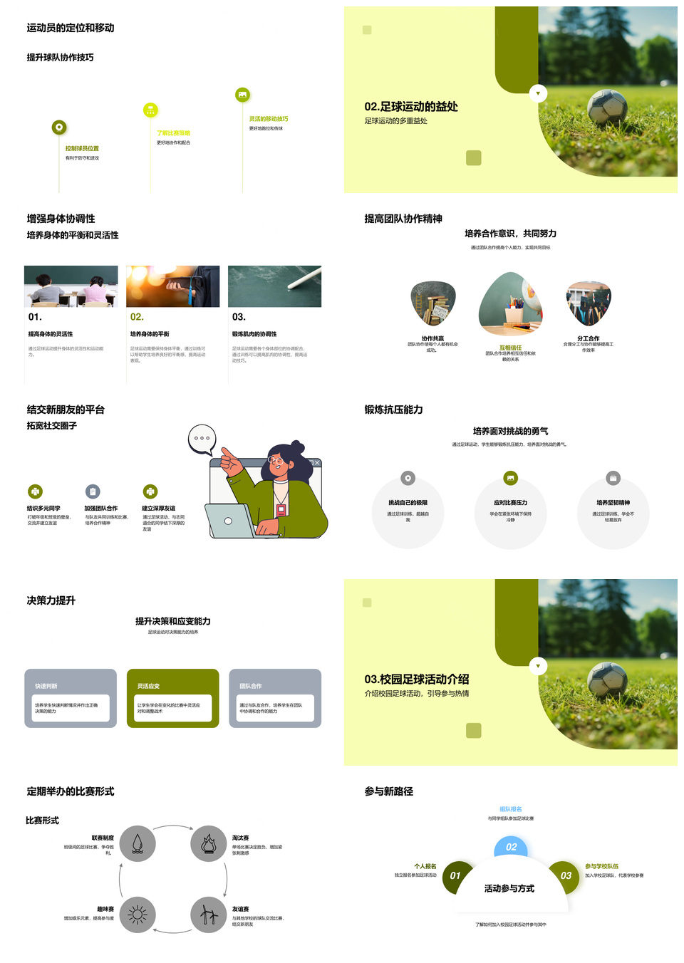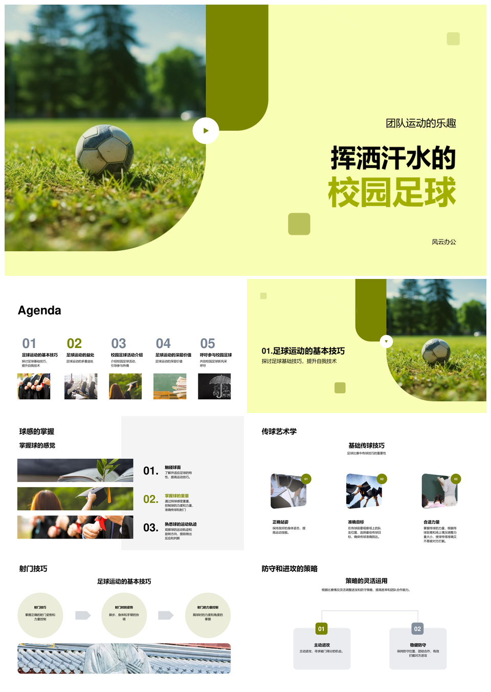 风云办公提供的校园足球团队技巧攻防协调训练PPT模板,下载格式为pptx,一共33页,作品中文字及图均可以修改和编辑,图片更改请在作品中右键图片并更换,文字修改请直接点击文字进行修改。