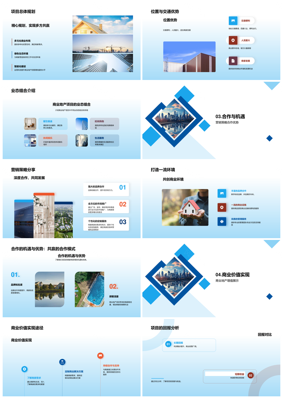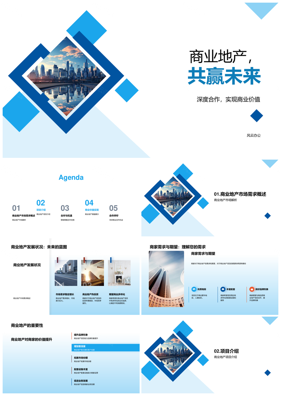 风云办公提供的商业地产深度合作共赢未来营销规划PPT模板,下载格式为pptx,一共23页,作品中文字及图均可以修改和编辑,图片更改请在作品中右键图片并更换,文字修改请直接点击文字进行修改。