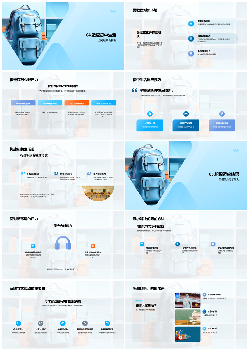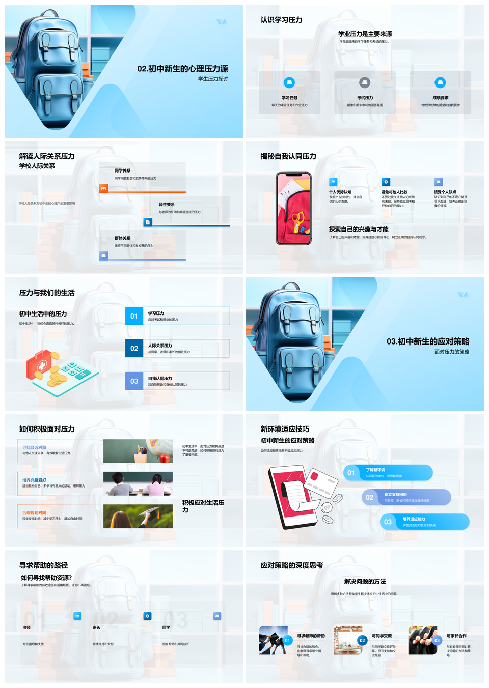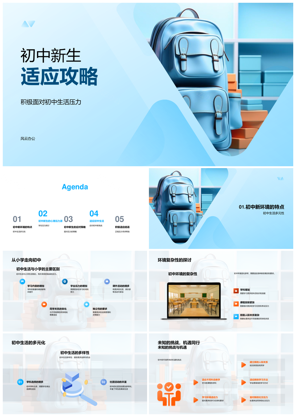 初中新生适应复杂环境多元生活压力背包攻略PPT模板推荐