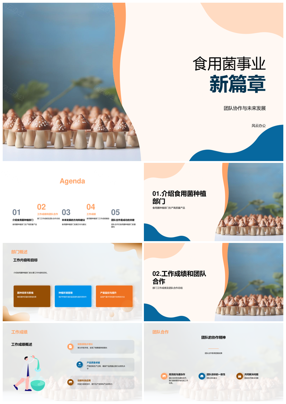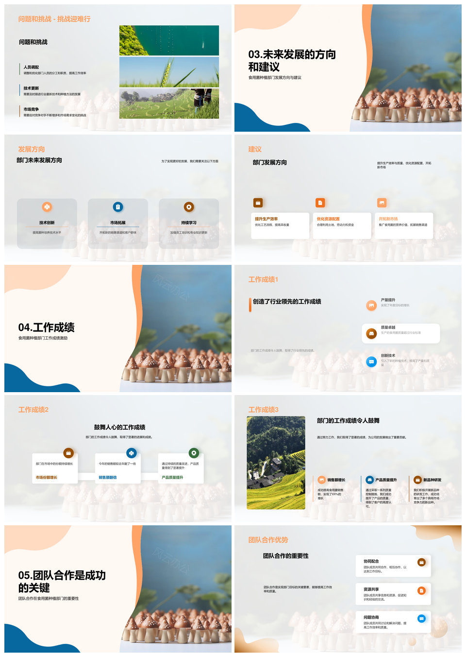 这是一张食用菌种植部门创新奋进共创辉煌结硕果PPT模板,包含食用菌种植部门、创新、奋进、共创辉煌、结硕果等主题内容,也可用作食用菌种植部门创新奋进、创新奋进共创辉煌、种植部门创新奋进共创、奋进共创辉煌硕果、食用菌种植部门创新、创新奋进共创、奋进共创辉煌、共创辉煌硕果、食用菌种植部门、创新奋进、奋进共创、共创辉煌、辉煌硕果、种植部门创新、共创硕果等PPT场景使用。 风云办公提供的食用菌种植部门创新奋进共创辉煌结硕果PPT模板,下载格式为pptx,一共20页,作品中文字及图均可以修改和编辑,图片更改请在作品中右键图片并更换,文字修改请直接点击文字进行修改。